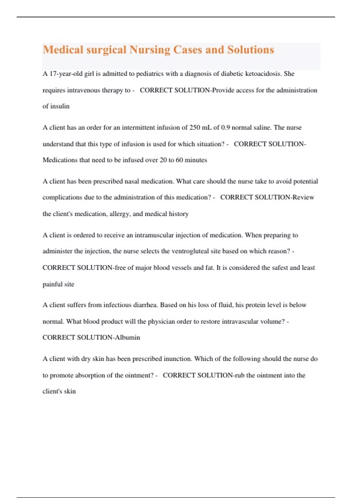 Medical surgical Nursing Cases and Solutions A 17-year-old girl is admitted to pediatrics with a diagnosis of diabetic ketoacidosis. She requires intravenous therapy to - CORRECT SOLUTION-Provide access for the administration of insulin A client has an order for an intermittent infusion of 250 mL of 0.9 normal saline. The nurse understand that this type of infusion is used for which situation? - CORRECT SOLUTIONMedications that need to be infused over 20 to 60 minutes A client has been prescribed nasal medication. What care should the nurse take to avoid potential complications due to the administration of this medication? - CORRECT SOLUTION-Review the client's medication, allergy, and medical history A client is ordered to receive an intramuscular injection of medication. When preparing to administer the injection, the nurse selects the ventrogluteal site based on which reason? - CORRECT SOLUTION-free of major blood vessels and fat. It is considered the safest and least painful site A client suffers from infectious diarrhea. Based on his loss of fluid, his protein level is below normal. What blood product will the physician order to restore intravascular volume? - CORRECT SOLUTION-Albumin A client with dry skin has been prescribed inunction. Which of the following should the nurse do to promote absorption of the ointment? - CORRECT SOLUTION-rub the ointment into the client's skin