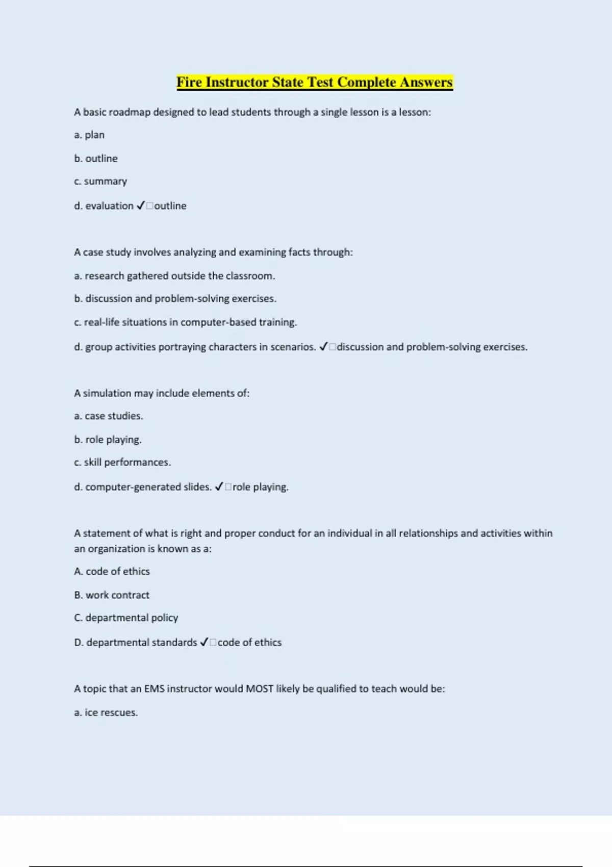 Fire Instructor State Test Complete Answers A basic roadmap designed to lead students through a single lesson is a lesson: a. plan b. outline c. summary d. evaluation ️outline A case study involves analyzing and examining facts through: a. research gathered outside the classroom. b. discussion and problem-solving exercises. c. real-life situations in computer-based training. d. group activities portraying characters in scenarios. ️discussion and problem-solving exercises. A simulation may include elements of: a. case studies. b. role playing. c. skill performances. d. computer-generated slides. ️role playing. A statement of what is right and proper conduct for an individual in all relationships and activities within an organization is known as a: A. code of ethics B. work contract C. departmental policy D. departmental standards ️code of ethics A topic that an EMS instructor would MOST likely be qualified to teach would be: a. ice rescues. b. scene safety. c. confined-space entry. d. using a portable fire extinguisher. ️scene safety. A wrongful act resulting in harm is known as a (an): a. act of omission. b. act of commission. c. breach of good faith. d. breach of responsibility. ️act of commission. Application can be combined with: a. evaluation b. assessment c. preparation d. presentation ️presentation At what rate of speed should the instructor FIRST demonstrate a skill? a. fast b. slow c. normal d. average ️normal Casualty simulations are an example of a: a. simulated training aid b. training prop c. projected training aid d. nonprojected training aid ️nonprojected training aid Divide task into the basic _______ required to perform each task. a. knowledge and skill steps b. outcomes and information c. information and skill steps d. outcomes and knowledge ️knowledge and skill steps During lesson plan revision, evaluations should provide: a. a definite list of revisions. b. a timeframe for revisions. c. cost analysis for revisions. d. opinions of other instructors. ️a definite list of revision