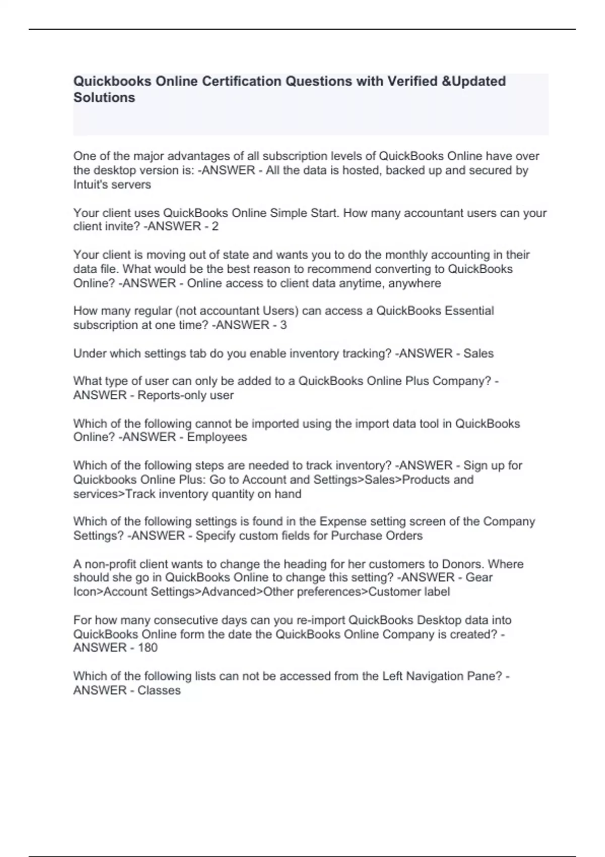 One of the major advantages of all subscription levels of QuickBooks Online have over the desktop version is: -ANSWER - All the data is hosted, backed up and secured by Intuit's servers Your client uses QuickBooks Online Simple Start. How many accountant users can your client invite? -ANSWER - 2 Your client is moving out of state and wants you to do the monthly accounting in their data file. What would be the best reason to recommend converting to QuickBooks Online? -ANSWER - Online access to client data anytime, anywhere How many regular (not accountant Users) can access a QuickBooks Essential subscription at one time? -ANSWER - 3 Under which settings tab do you enable inventory tracking? -ANSWER - Sales What type of user can only be added to a QuickBooks Online Plus Company? -ANSWER - Reports-only user Which of the following cannot be imported using the import data tool in QuickBooks Online? -ANSWER - Employees Which of the following steps are needed to track inventory? -ANSWER - Sign up for Quickbooks Online Plus: Go to Account and SettingsSalesProducts and servicesTrack inventory quantity on hand Which of the following settings is found in the Expense setting screen of the Company Settings? -ANSWER - Specify custom fields for Purchase Orders A non-profit client wants to change the heading for her customers to Donors. Where should she go in QuickBooks Online to change this setting? -ANSWER - Gear IconAccount SettingsAdvancedOther preferencesCustomer label For how many consecutive days can you re-import QuickBooks Desktop data into QuickBooks Online form the date t