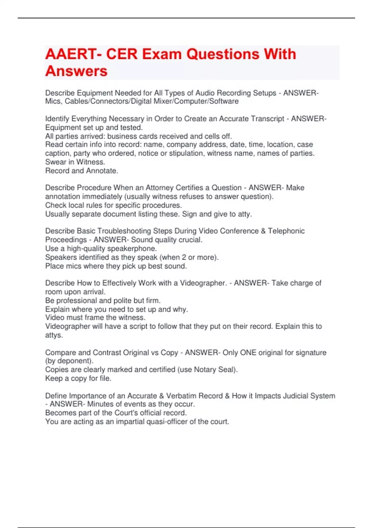 AAERT- CER Exam Questions With Answers Describe Equipment Needed for All Types of Audio Recording Setups - ANSWER- Mics, Cables/Connectors/Digital Mixer/Computer/Software Identify Everything Necessary in Order to Create an Accurate Transcript - ANSWER- Equipment set up and tested. All parties arrived: business cards received and cells off. Read certain info into record: name, company address, date, time, location, case caption, party who ordered, notice or stipulation, witness name, names of parties. Swear in Witness. Record and Annotate. Describe Procedure When an Attorney Certifies a Question - ANSWER- Make annotation immediately (usually witness refuses to answer question). Check local rules for specific procedures. Usually separate document listing these. Sign and give to atty. Describe Basic Troubleshooting Steps During Video Conference & Telephonic Proceedings - ANSWER- Sound quality crucial. Use a high-quality speakerphone. Speakers identified as they speak (when 2 or more). Place mics where they pick up best sound. Describe How to Effectively Work with a Videographer. - ANSWER- Take charge of room upon arrival. Be professional and polite but firm. Explain where you need to set up and why. Video must frame the witness. Videographer will have a script to follow that they put on their record. Explain this to attys. Compare and Contrast Original vs Copy - ANSWER- Only ONE original for signature (by deponent). Copies are clearly marked and certified (use Notary Seal). Keep a copy for file. Define Importance of an Accurate & Verbatim Record & How it Impacts Judicial System - ANSWER- Minutes of events as they occur. Becomes part of the Court's official record. You are acting as an impartial quasi-officer of the court. Describe How to Request and/or Research Proper Nouns to Verify Spelling for Transcription - ANSWER- Ask parties after hearing. Describe Procedure When an Attorney Strikes Something from the Record - ANSWER- Removes a portion of the record from consideration by a fact-finder. The material stricken remains physically in evidence-in case the ruling to strike is found on appeal to be in error.