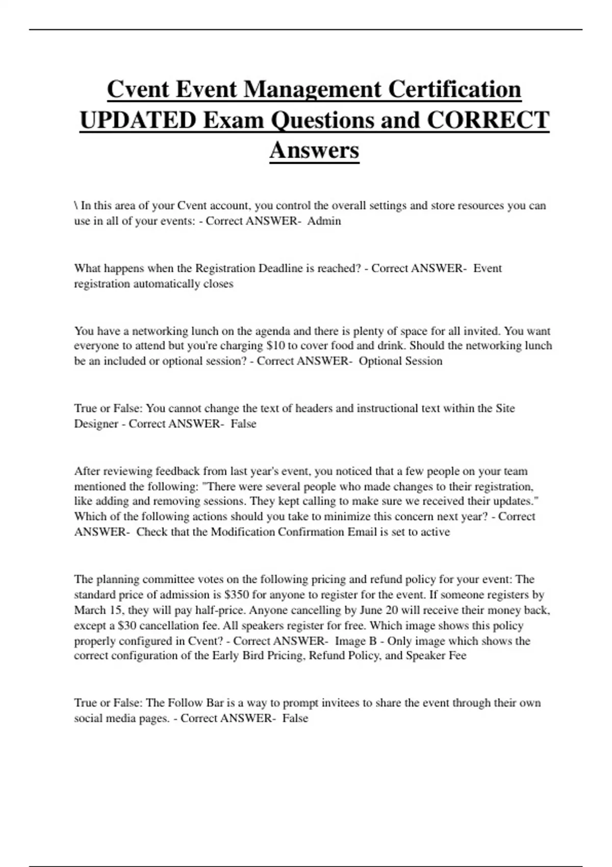 Cvent Event Management Certification UPDATED Exam Questions and CORRECT Answers In this area of your Cvent account, you control the overall settings and store resources you can use in all of your events: - Correct ANSWER- Admin What happens when the Registration Deadline is reached? - Correct ANSWER- Event registration automatically closes You have a networking lunch on the agenda and there is plenty of space for all invited. You want everyone to attend but you're charging $10 to cover food and drink. Should the networking lunch be an included or optional session? - Correct ANSWER- Optional Session