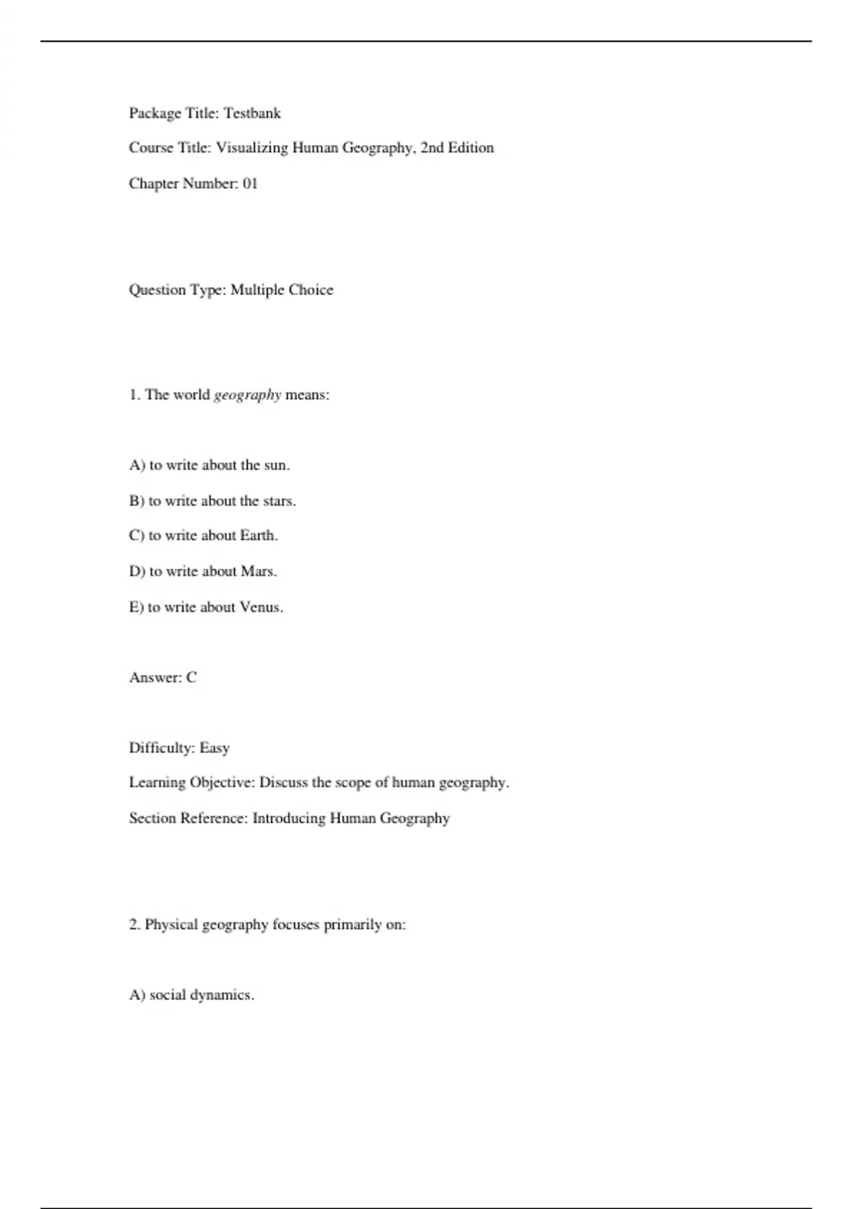Test Item File- Practice Test Bank - Visualizing Human Geography At Home in a Diverse World,Greiner,2e