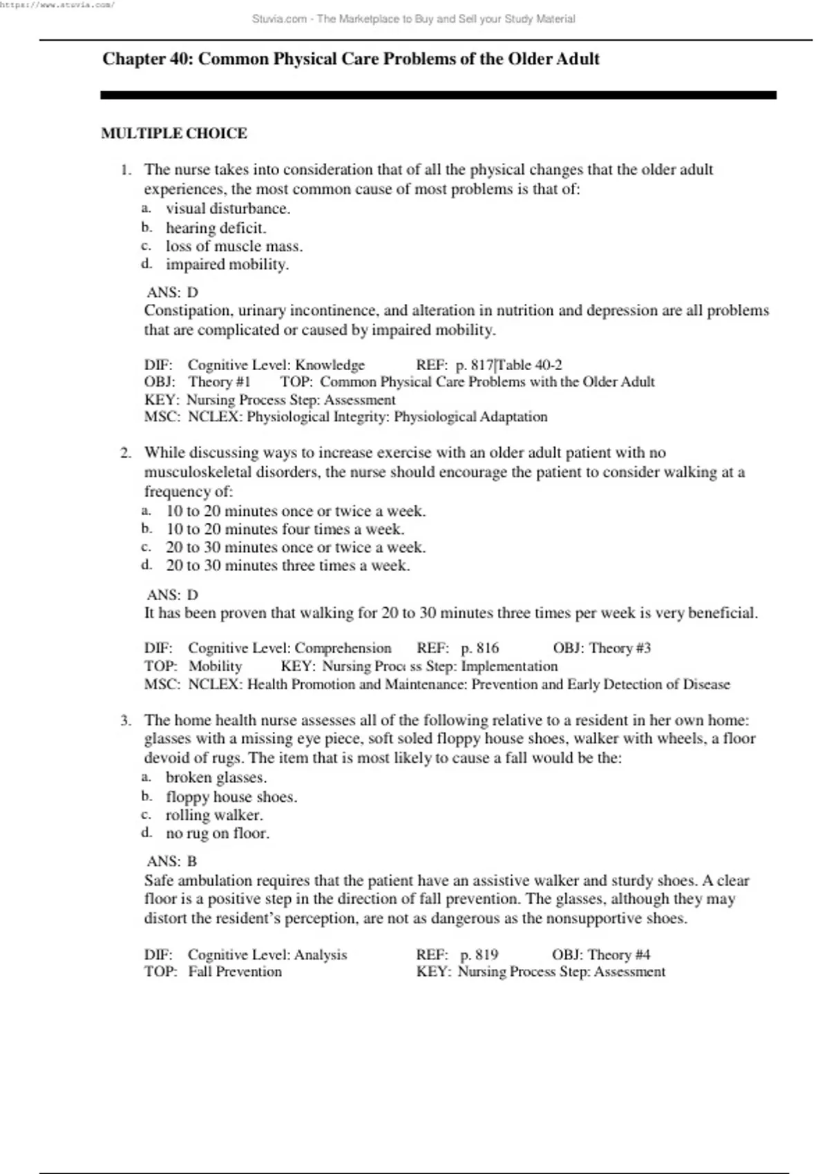 The nurse lists the most common causes of polypharmacy as: (Select all that apply.) a. use of mail order sources. b. being prescribed to by several health care providers. c. sharing drugs with others. d. many drugs being prescribed under different names. e. availability of OTC medications. ANS: A, B, D, E Treatment by several health care providers, many drugs prescribed under different names, ordering drugs from mail order sources, and the extensive availability of OTC medications increase the risk for polypharmacy. DIF: Cognitive Level: Comprehension REF: p. 824 OBJ: Theory #9 TOP: Polypharmacy KEY: Nursing Process Step: Implementation MSC: NCLEX: Safe, Effective Care Environment: Safety and Infection Control S - The Marketplace to Buy and Sell your Study Material DIF: Cognitive Level: Knowledge REF: p. 823 OBJ: Theory #2 TOP: Tinnitus KEY: Nursing Pr cess Step: Assessmen t 2. The older adults, especially women, are at high risk for decreased mobility. Which nutrient(s) are critical for women to take to decrease this risk? (Select all that apply.) a. Protein b. Fat c. Carbohydrates d. Calcium e. Vitamin D ANS: D, E Proper treatment for arthritis and osteoporosis will help prevent immobility problems. Estrogen replacement therapy (ERT) and adequate dietary or supplemental calcium and vitamin D in combination with weight bearing exercise are protective against osteoporosis in women. DIF: Cognitive Level: Comprehension REF: p. 821|Table 40-3 OBJ: Theory #5 TOP: Mobility and Nutrients KEY: Nursing Process Step: N/A MSC: NCLEX: N/A 3. A nurse reviewing the medication list for an older adult patient notices several drugs that would increase the risk of falls because of orthostatic hypotension, which are: (Select all that apply.) a. anticoagulants. b. diuretics. c. stool softeners. d. antihypertensives. e. antihistamines. ANS: B, D, E Diuretics, hypertensives, and antihistamines contribute to orthostatic hypotension, a common cause of falls. DIF: Cognitive Level: Comprehension REF: p. 818 OBJ: Theory #2 TOP: Multi pharmacy KEY: Nursing Process Step: Assessment MSC: NCLEX: Physiological Integrity: Pharmacological Therapies