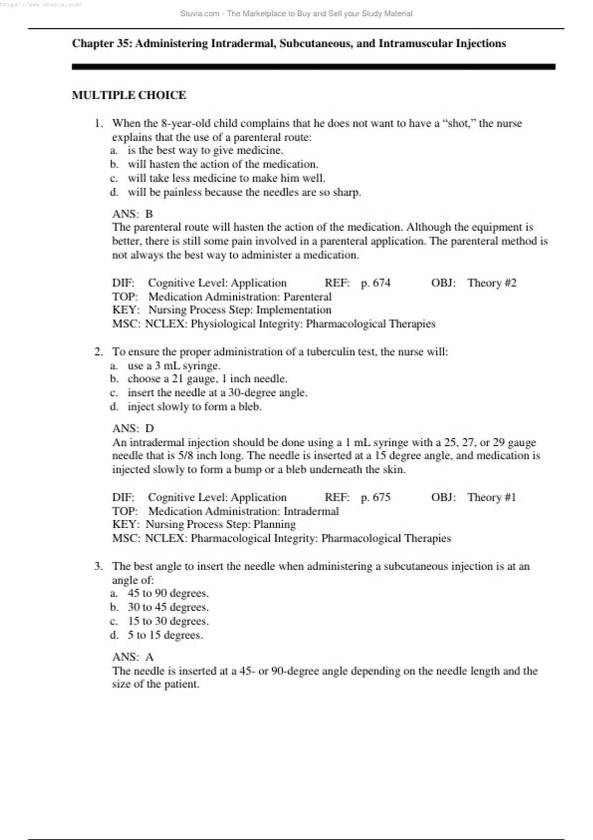 1. When reconstituting a medication from a powder, the nurse will: (Select all that apply.) a. confirm the type of diluent required. b. use only a 23-gauge needle to inject a reconstituted medication. c. thoroughly mix solute with diluent. d. roll the solute between hands to warm powder. e. label the medication as to the amount of medication per volume after dilution. ANS: A, C, E After confirming the type of diluent required, the solute must be mixed thoroughly with the recommended diluent, then labeled as to the amount of medication per volume after dilution. DIF: Cognitive Level: Application REF: p. 681 OBJ: Clinical Practice #4 TOP: Mixing Medications from Powder KEY: Nursing Process Step: Implementation MSC: NCLEX: Physiological Integrity: Pharmacological Therapies COMPLETION 1. The IM injection site recommended for infants under 12 months of age is the . ANS: vastus lateralis The vastus lateralis muscle is the site of choice for infants under 12 months for IM injections. DIF: Cognitive Level: Knowledge REF: p. 693|Skill 35-3 OBJ: Theory #2 TOP: Medication Administration - Intramuscular KEY: Nursing Process Step: N/A MSC: NCLEX: N/A ORDERING S - The Marketplace to Buy and Sell your Study Material 1. You are preparing to mix short-acting and long-acting insulin. Prioritize these steps accordingly. (Separate letters with a comma and space as follows: A, B, C, D, E, F.) a. Withdraw prescribed amount of short-acting insulin. b. Inject air into short-acting insulin. c. Check medications with eMAR and MAR using three medication checks. d. Choose and prepare site before injection. e. Withdraw prescribed amount of long-acting insulin. f. Inject air into long-acting insulin. ANS: C, F, B, A, E, D These are the proper steps to take when mixing short- and long-acting insulin in one syringe. DIF: Cognitive Level: Analysis REF: p. 682|Skill 35-2 OBJ: Clinical Practice #5 TOP: Mixing Short- and Long-Acting Insulin in One Syringe KEY: Nursing Process Step: Implementation MSC: NCLEX: Pharmacological Therapies