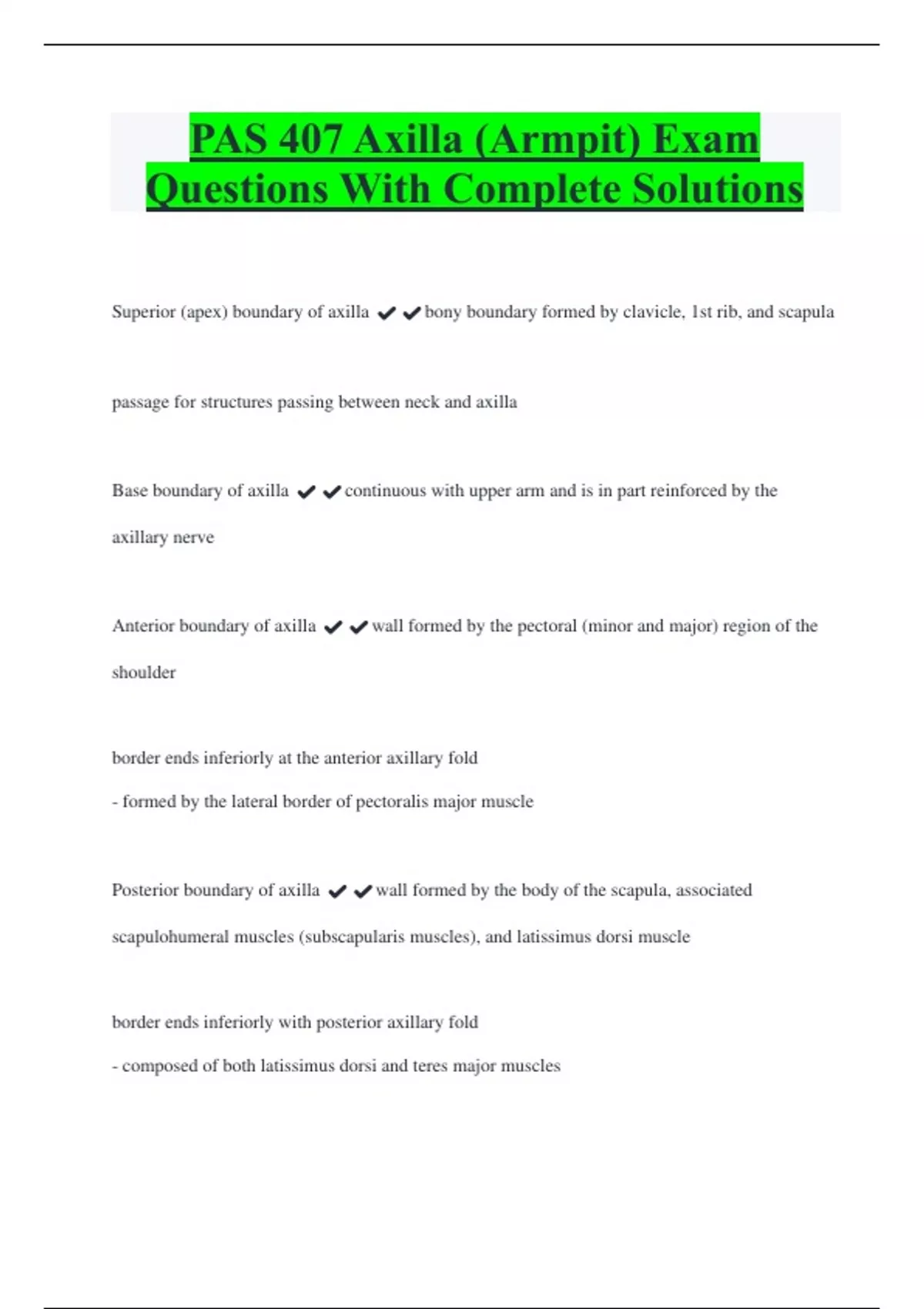 PAS 407 Axilla (Armpit) Exam Questions With Complete Solutions