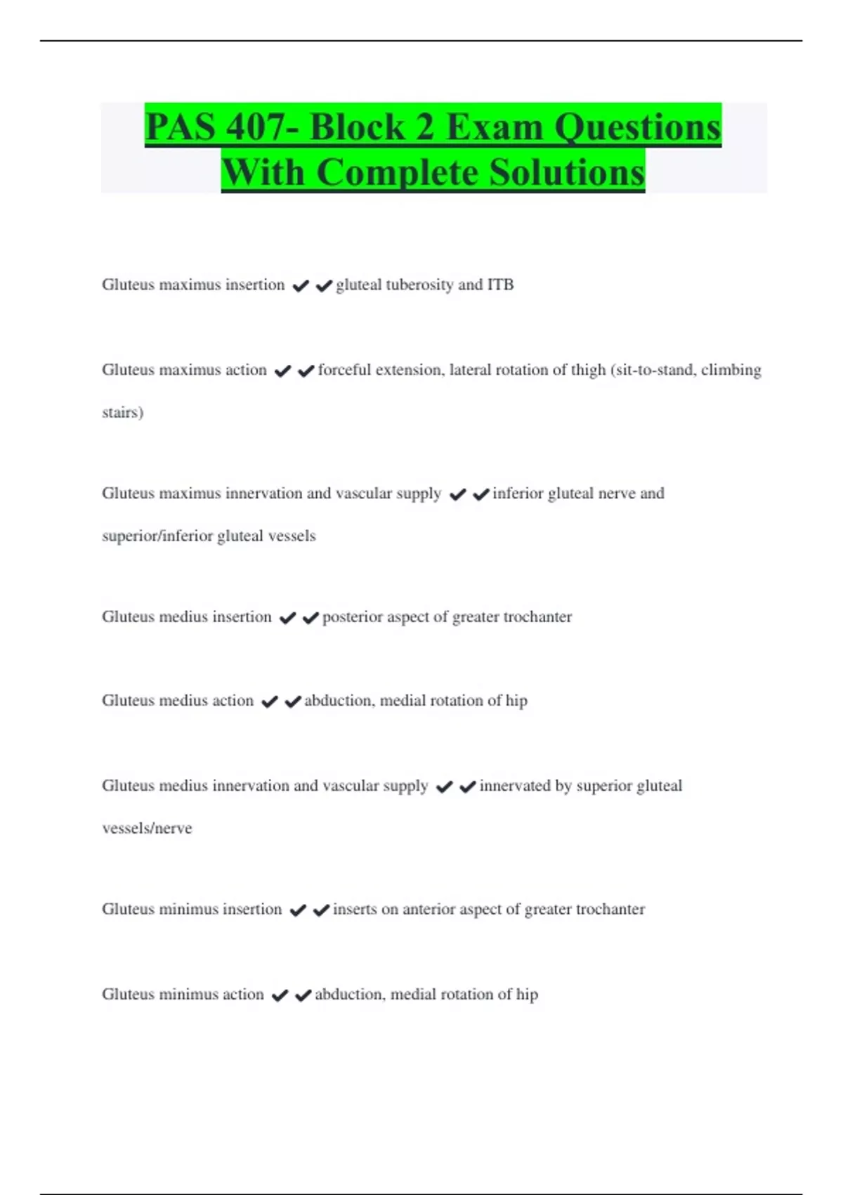 PAS 407- Block 2 Exam Questions With Complete Solutions Gluteus maximus insertion ️️gluteal tuberosity and ITB Gluteus maximus action ️️forceful extension, lateral rotation of thigh (sit-to-stand, climbing stairs) Gluteus maximus innervation and vascular supply ️️inferior gluteal nerve and superior/inferior gluteal vessels Gluteus medius insertion ️️posterior aspect of greater trochanter Gluteus medius action ️️abduction, medial rotation of hip Gluteus medius innervation and vascular supply ️️innervated by superior gluteal vessels/nerve
