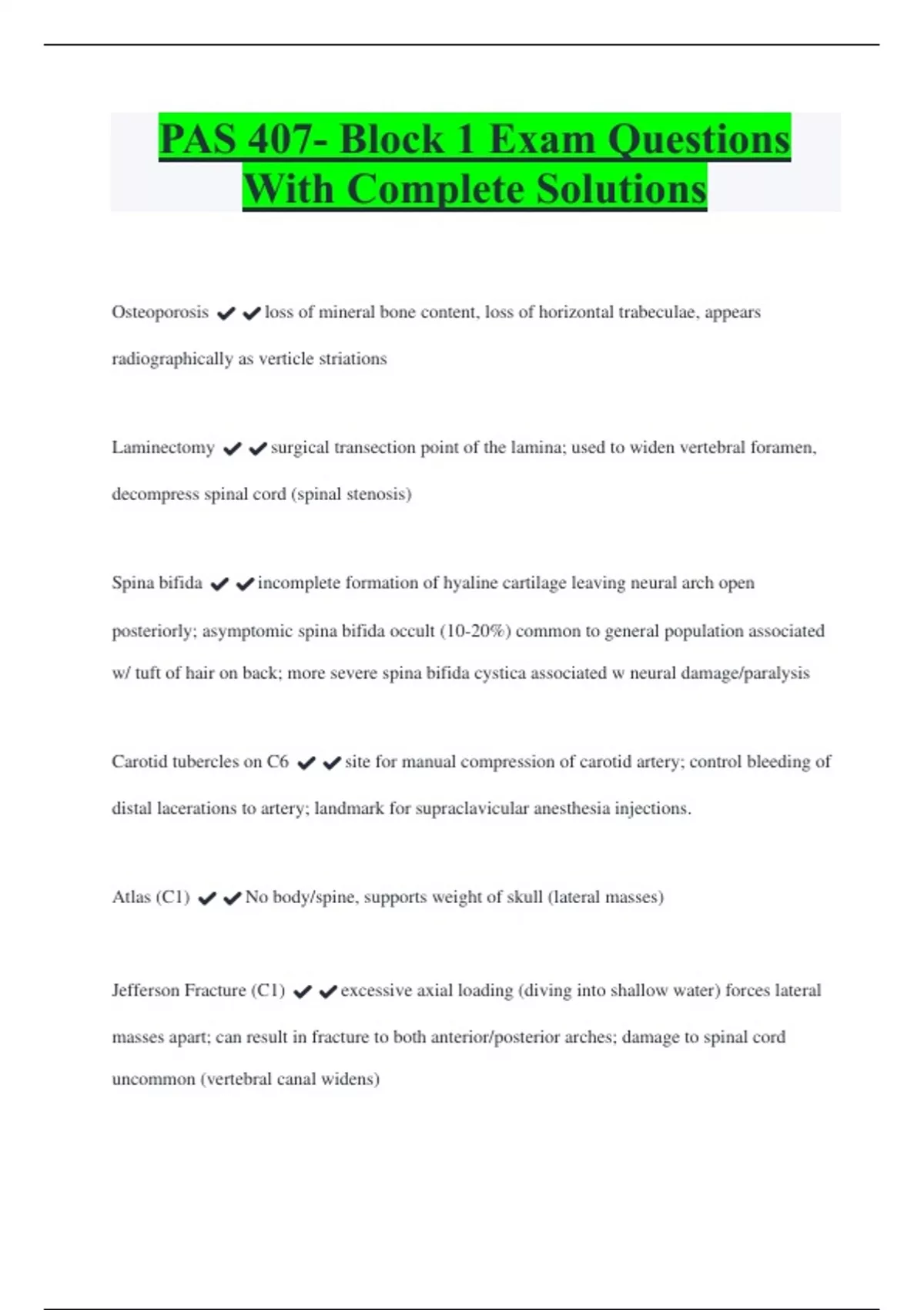 PAS 407- Block 1 Exam Questions With Complete Solutions Osteoporosis ️️loss of mineral bone content, loss of horizontal trabeculae, appears radiographically as verticle striations Laminectomy ️️surgical transection point of the lamina; used to widen vertebral foramen, decompress spinal cord (spinal stenosis) Spina bifida ️️incomplete formation of hyaline cartilage leaving neural arch open posteriorly; asymptomic spina bifida occult (10-20%) common to general population associated w/ tuft of hair on back; more severe spina bifida cystica associated w neural damage/paralysis Carotid tubercles on C6 ️️site for manual compression of carotid artery; control bleeding of distal lacerations to artery; landmark for supraclavicular anesthesia injections