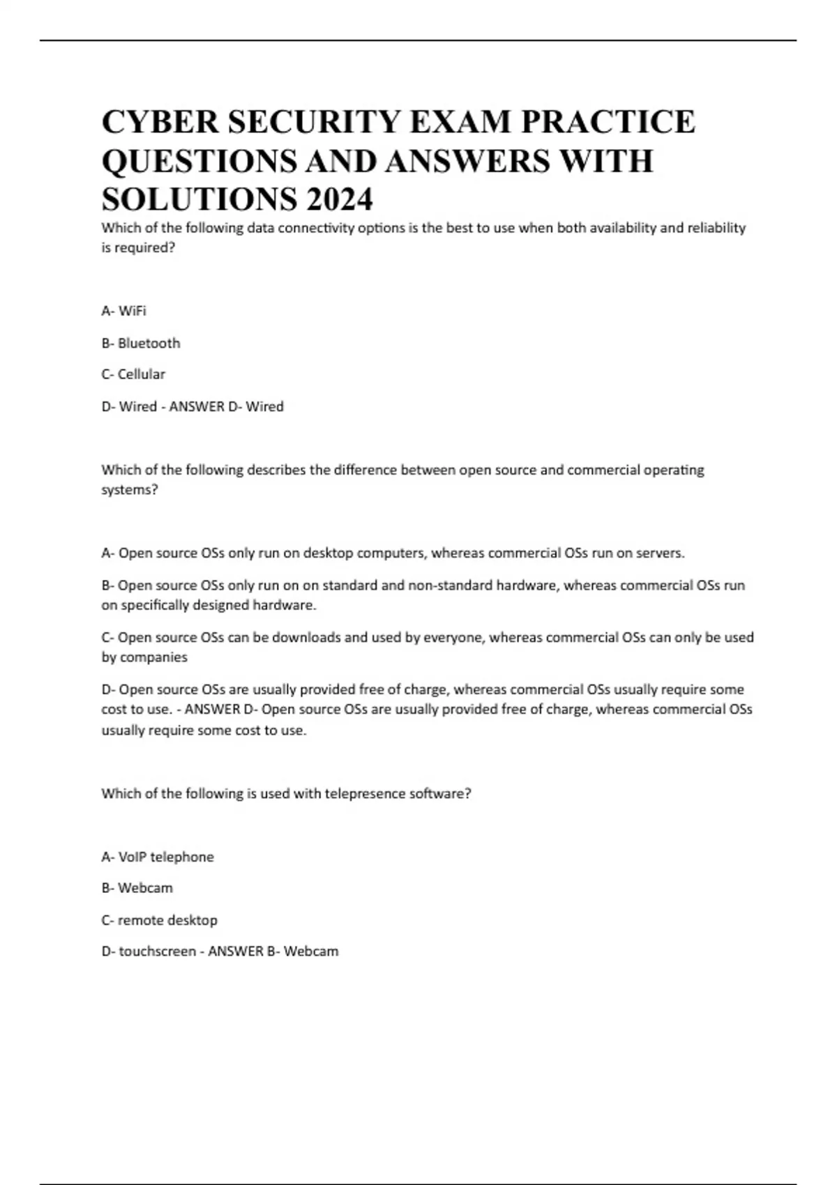 CYBER SECURITY EXAM PRACTICE QUESTIONS AND ANSWERS WITH SOLUTIONS 2024