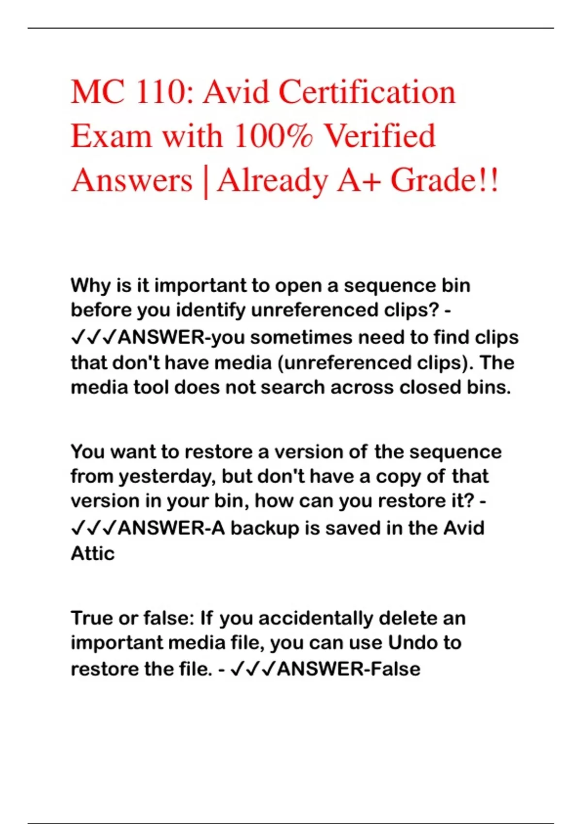 MC 110: Avid Certification Exam with 100% Verified Answers | Already A+ Grade!! Why is it important to open a sequence bin before you identify unreferenced clips? - ANSWER-you sometimes need to find clips that don't have media (unreferenced clips). The media tool does not search across closed bins. You want to restore a version of the sequence from yesterday, but don't have a copy of that version in your bin, how can you restore it? - ANSWER-A backup is saved in the Avid Attic True or false: If you accidentally delete an important media file, you can use Undo to restore the file. - ANSWER-False What is the inner box in a tracker called? How is it used? - ANSWER-Reference pattern. It defines the pixels that will be followed and tracked from frame to frame What is the outer box in a tracker called? How is it used? - ANSWER- From which menu can you open the Source Browser? - ANSWER-File > input > source browser, or right click bin > input >source browser In the Source Browser, how can you mark a Folder as Favorite? - ANSWER-Select the star icon in the upper left How can you remove a folder from the favorites list in the source browser? - ANSWER-Click the star button again Which button enables the source browser to display a file folder as a media volume? - ANSWER-View file folder as media volume button Name two settings that affect how files are imported to Media Composer. - ANSWER-Import settings: control how avid does or does not modify the image AND media creation settings: control size, resolution, and format of media file Which setting will resize a large photograph during import to avoid distorting it? - ANSWER-Resize image to fit format raster Which function will copy a media file, without recompressing it? - ANSWER-consolidate Which function will convert a media file, modifying its codec and/or frame rate? - ANSWER-transcode