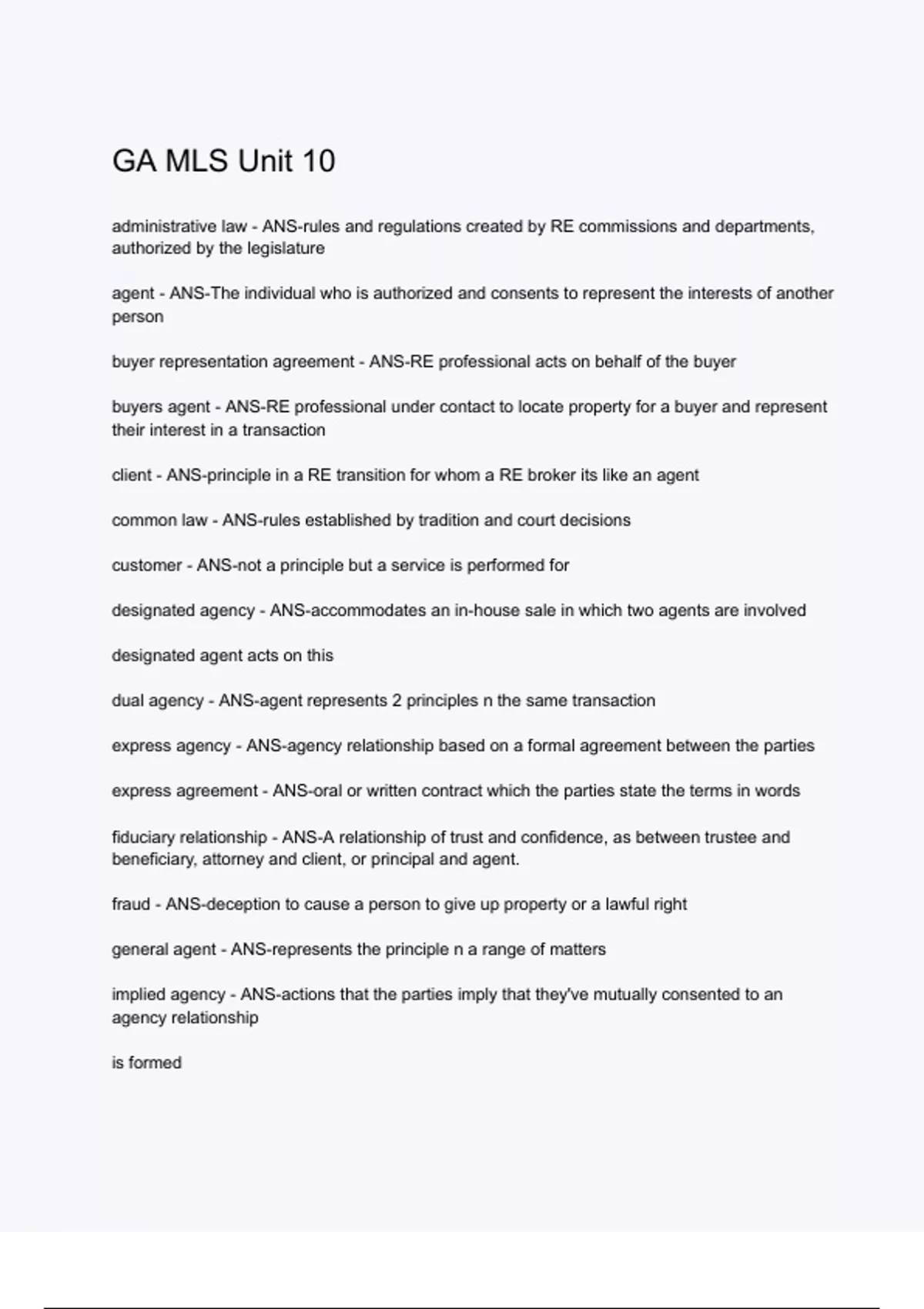 GA MLS Unit 10 Questions and correct answers | already graded a+ | verified answers
