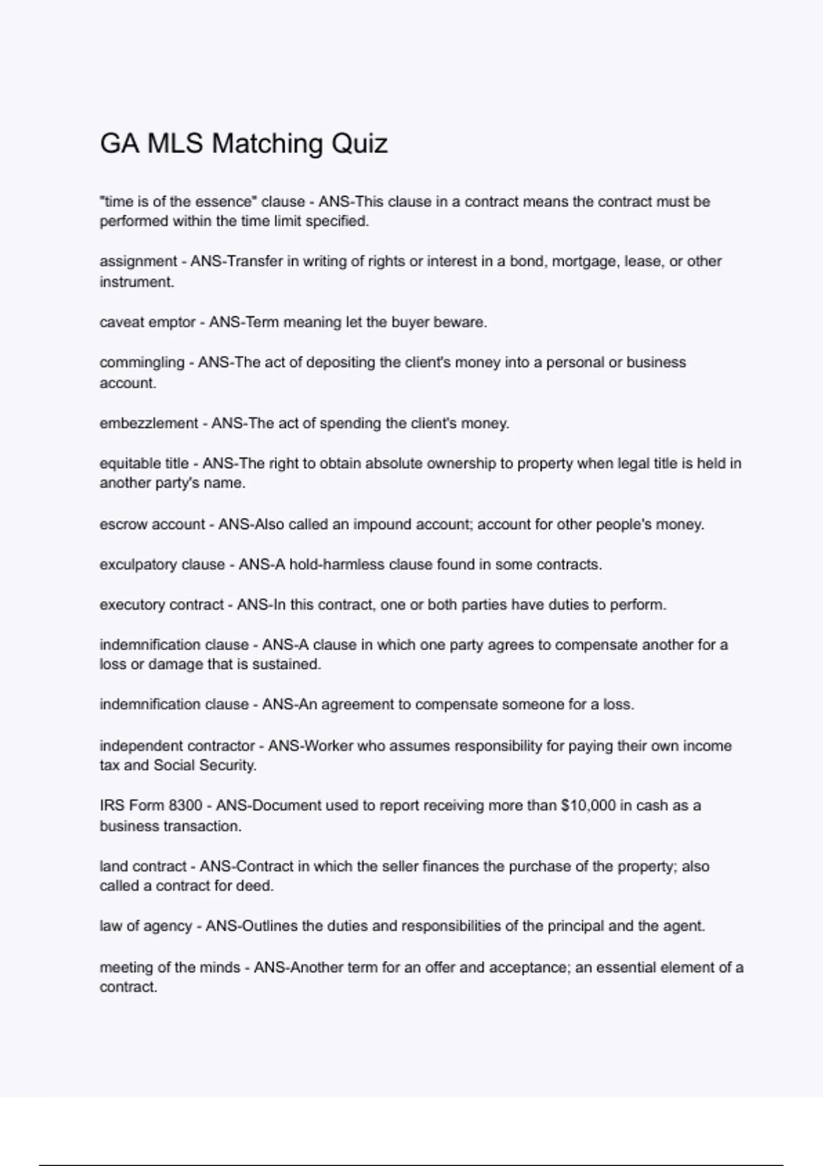 GA MLS Matching Quiz Questions and correct answers | already graded a+ | verified answers
