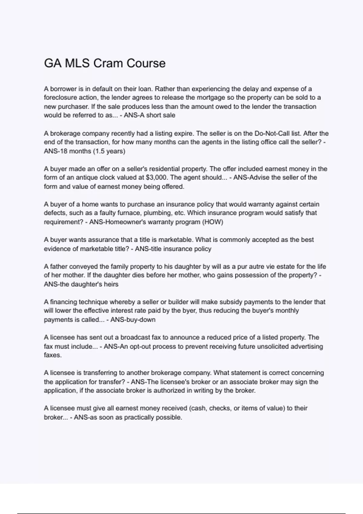 GA MLS Cram Course Questions and correct answers | already graded a+ | verified answers