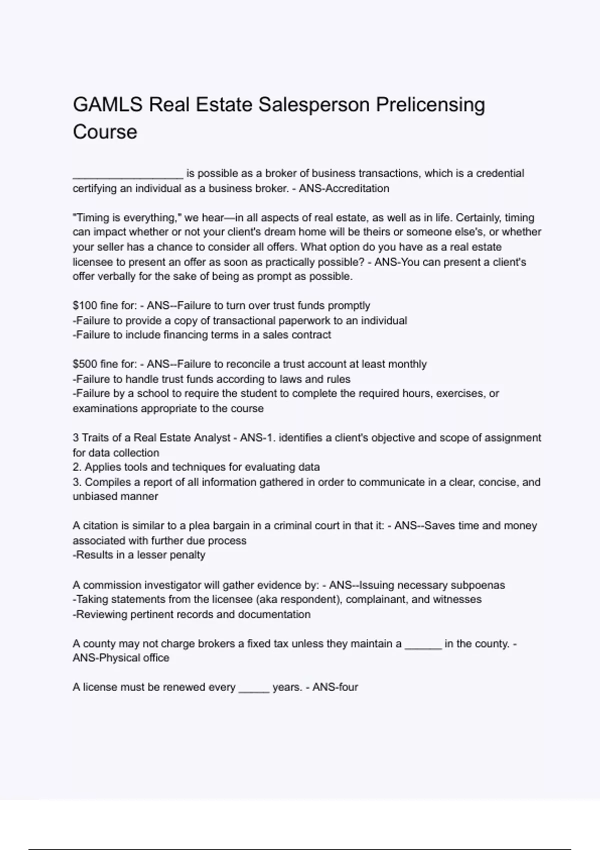 GAMLS Real Estate Salesperson Prelicensing Course Questions and correct answers | already graded a+ | verified answers