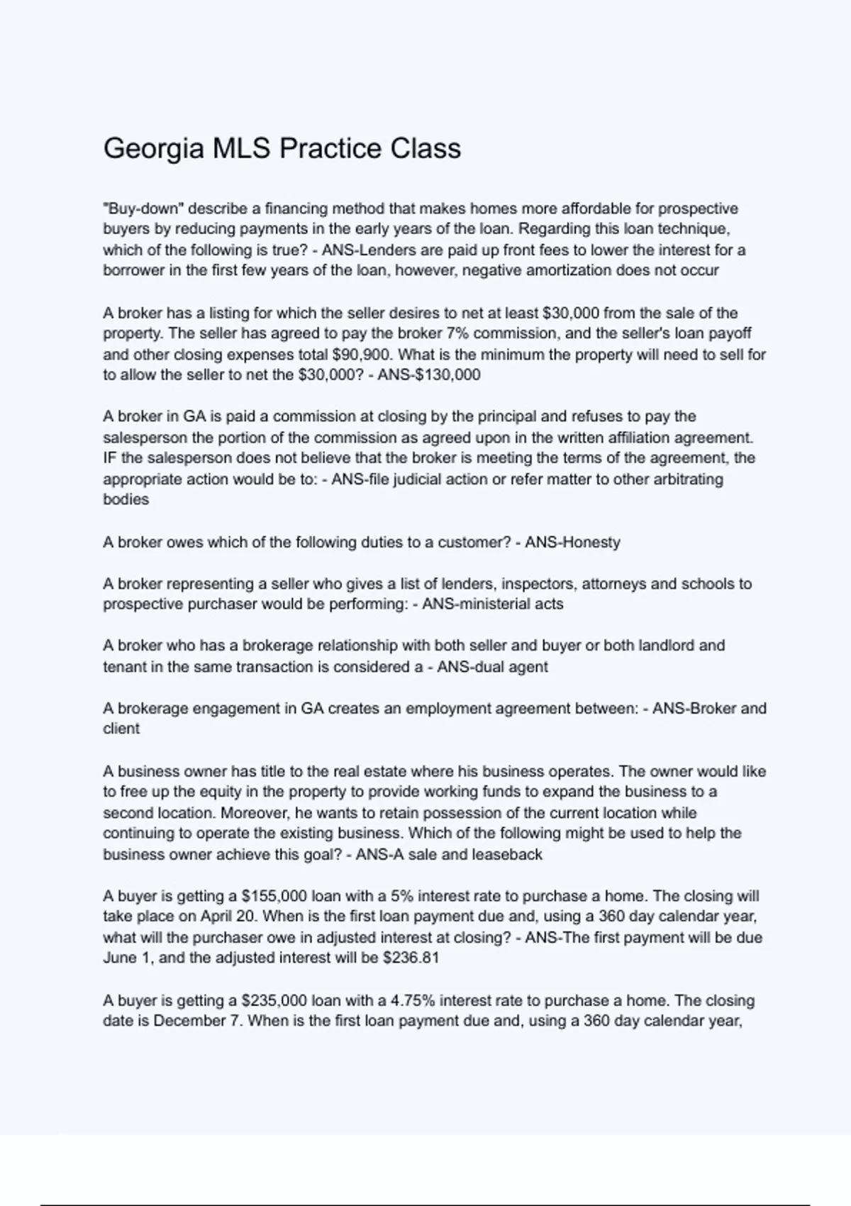 Georgia MLS Practice Class Questions and correct answers | already graded a+ | verified answers