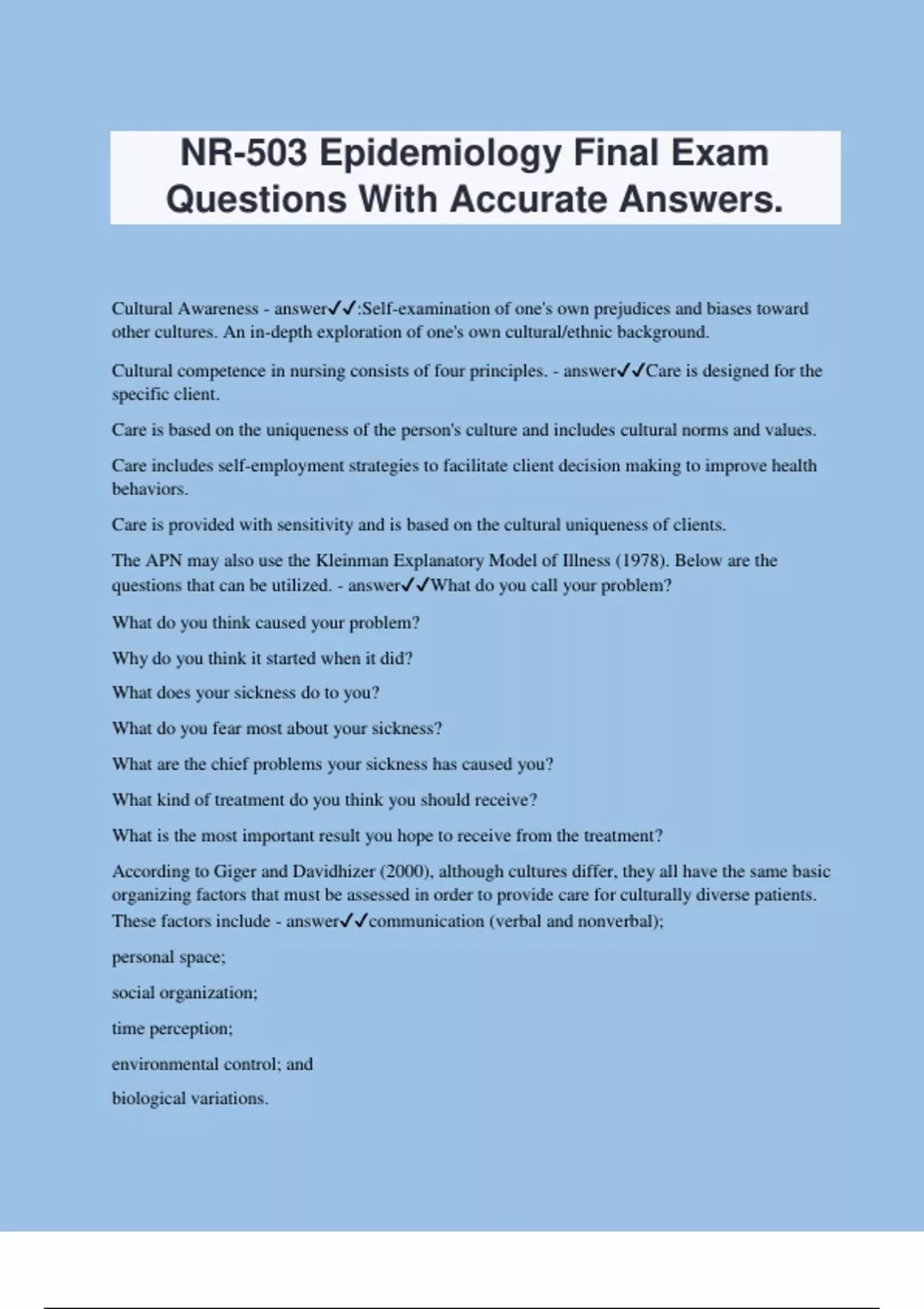NR-503 Epidemiology Final Exam Questions With Accurate Answers. Cultural Awareness - answer:Self-examination of one's own prejudices and biases toward other cultures. An in-depth exploration of one's own cultural/ethnic background. Cultural competence in nursing consists of four principles. - answerCare is designed for the specific client. Care is based on the uniqueness of the person's culture and includes cultural norms and values. Care includes self-employment strategies to facilitate client decision making to improve health behaviors. Care is provided with sensitivity and is based on the cultural uniqueness of clients. The APN may also use the Kleinman Explanatory Model of Illness (1978). Below are the questions that can be utilized. - answerWhat do you call your problem? What do you think caused your problem? Why do you think it started when it did? What does your sickness do to you? What do you fear most about your sickness? What are the chief problems your sickness has caused you? What kind of treatment do you think you should receive? What is the most important result you hope to receive from the treatment? According to Giger and Davidhizer (2000), although cultures differ, they all have the same basic organizing factors that must be assessed in order to provide care for culturally diverse patients. These factors include - answercommunication (verbal and nonverbal); personal space; social organization; time perception; environmental control; and biological variations. The NCCC uses four major approaches to fulfill its mission, including - answerWeb-based technical assistance, (2) knowledge development and dissemination, (3) supporting a community of learners, and (4) collaboration and partnerships with diverse groups. Epidemiological Triad: - answerhost, agent, environment Genetics - answerThe study of individual genes and their impact on relatively rare single gene disorders Absolute risk - answeris the probability of an event, such as illness, injury, or death. Gives no indication of how its magnitude compares with others The odds ratio - answerclosely approximates the relative risk if the disease is rare. Odds ratio and the relative risk are used - answerto assess the strength of association between risk factor and outcome. How is Attributible risk used - answeris used to make risk-based decisions for individuals. Population-attributable risk measures - answerare used to form public health decisions EGAPP: - answerEvaluation of Genomic Applications in Practice and Prevention GAPPNet - answerGenomic Applications in Practice and Prevention Network (established in 2009) is a collaborative initiative involving partners from across the public health sector working together to realize the promise of genomics in health care and disease prevention. GEDDI - answerGenetics Early Disease Detection Intervention project (GEDDI) (established in 2009) developed a model strategy for using clinical, genetic, and family history information to reduce the risk of disease, death, and disability in affected individuals, family members, and populations. HuGENet - answerHuman Genome Epidemiology Network (HuGENet) (established in 1998) helps translate genetic research findings into opportunities for preventive medicines and public health by advancing the synthesis, interpretation, and dissemination of population-based data on human genetic variation in health and disease. HuGENet reviews are systematic, peer- reviewed synopses of the epidemiologic aspects of human genes, including prevalence of allelic variants in different populations, population-based information on disease risk, evidence for gene-environment interaction and quantitative data on genetic tests and services carried out according to specific guidelines. NHANES III - answerDC's Office of Public Health Genomics (established in 2002) formed a multidisciplinary working group with members from across CDC. It developed a proposal to measure the prevalence of selected genetic variants of public health significance in a representative sample of the U.S. population and to examine the association between the selected genetic variants and disease outcomes available in NHANES III data. The World Health Organization defines a pandemic - answeras a global epidemic that spreads to more than one continent (WHO, 2009). One of the more recent pandemics that you might be familiar with is the H1N1 influenza outbreak of 2009. Outbreak - answerthe occurrence of disease within persons in excess of what would normally be expected in a clearly defined community, location, or time of year. An outbreak may only last for a matter of days or weeks, but may last for years Quarantine - answerthe separation and restriction of the movement of people who were or are exposed to a contagious disease for a set period of time, to see whether they become ill Antigenic drift - answeris a term describing the changes that occur within virus's ribonucleic acid that changes the virus. Typically, these changes create seasonal changes or new strains of a virus WHO Pandemic Phases - answerPhase 1—None of the current viruses circulating in animals have been reported to cause infection in humans. Phase 2—An animal-based influenza virus is known to have caused infection in humans and is considered a potential pandemic threat. Phase 3—An animal- or human-animal-based virus has caused some clusters of cases in people, but has not caused human-to-human transmission that is significant enough to cause community- level outbreaks. Phase 4—Human-to-human transmission of an animal or human-animal virus is causing community outbreaks and sustained disease. This is a significant shift in risk and any country with such an outbreak should consult with WHO. Phase 5—There is human-to-human spread of the virus in at least two countries. This phase means that pandemic is imminent and that community action and implementation of planned mitigation procedures is needed. Phase 6—This is the p