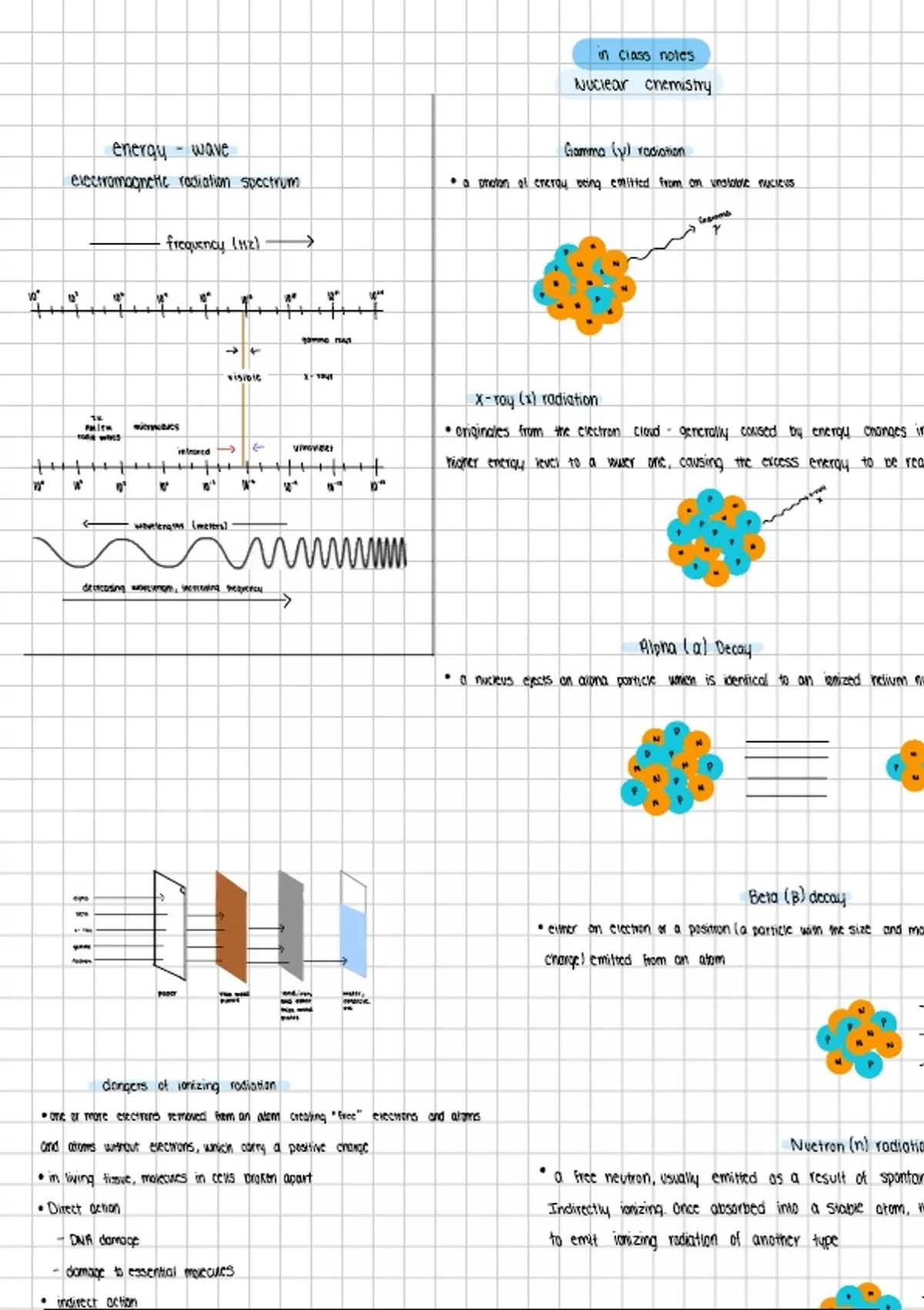 This document is focused on nuclear chemistry. There are notes on frequency waves, ionizing radiation, neutron radiation, beta decay, alpha decay, X-ray radiation, and gamma radiation.