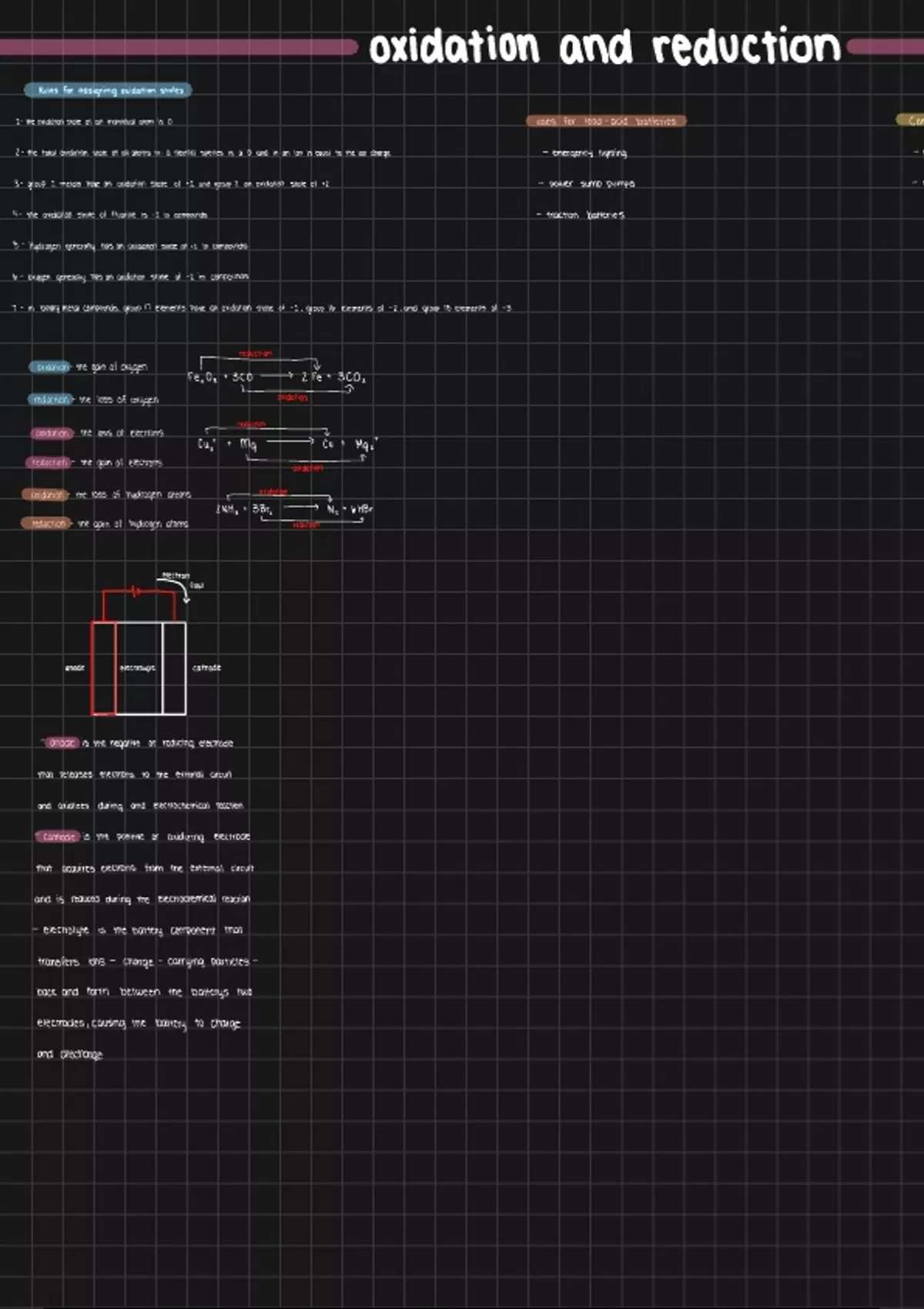 This document is focused on oxidation and reduction. There are notes on rules for assigning oxidation states, the uses for lead-acid batteries, and components in lead - acid battery.