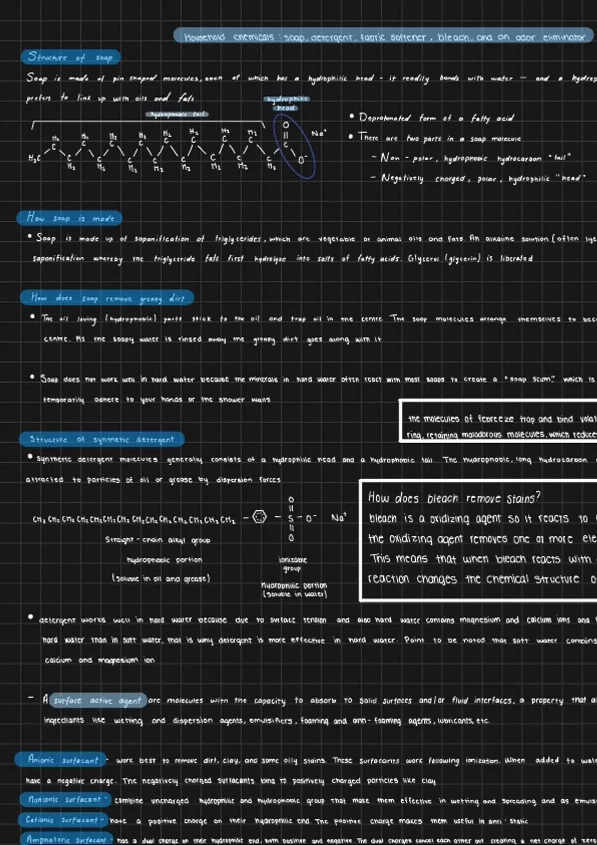 This document is focused on the chemistry of household chemicals like soap, detergent, fabric softener, bleach, and odor eliminator. There on notes on the structure of soap, fabric softener, and detergent.