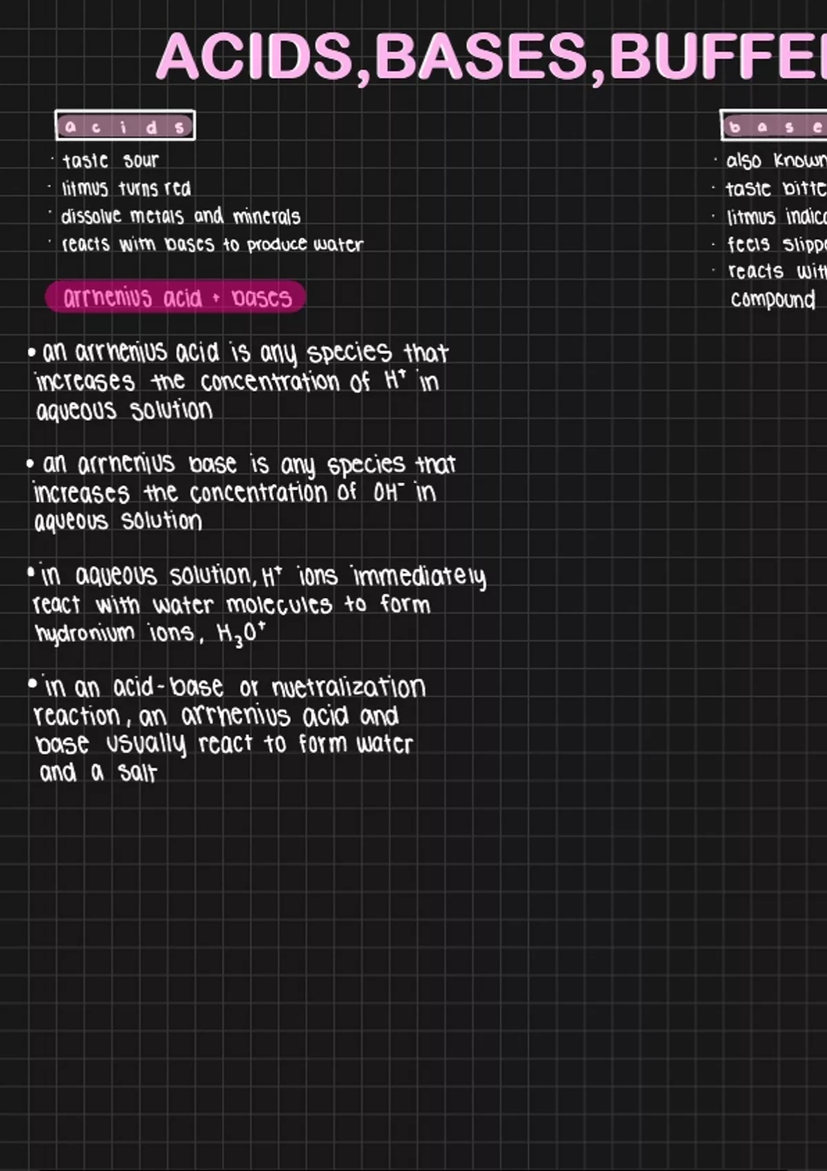 This document is focused on acids, bases, and buffers. There are notes on characteristics of acids and bases. There are also notes on Arrhenius acids and bases.