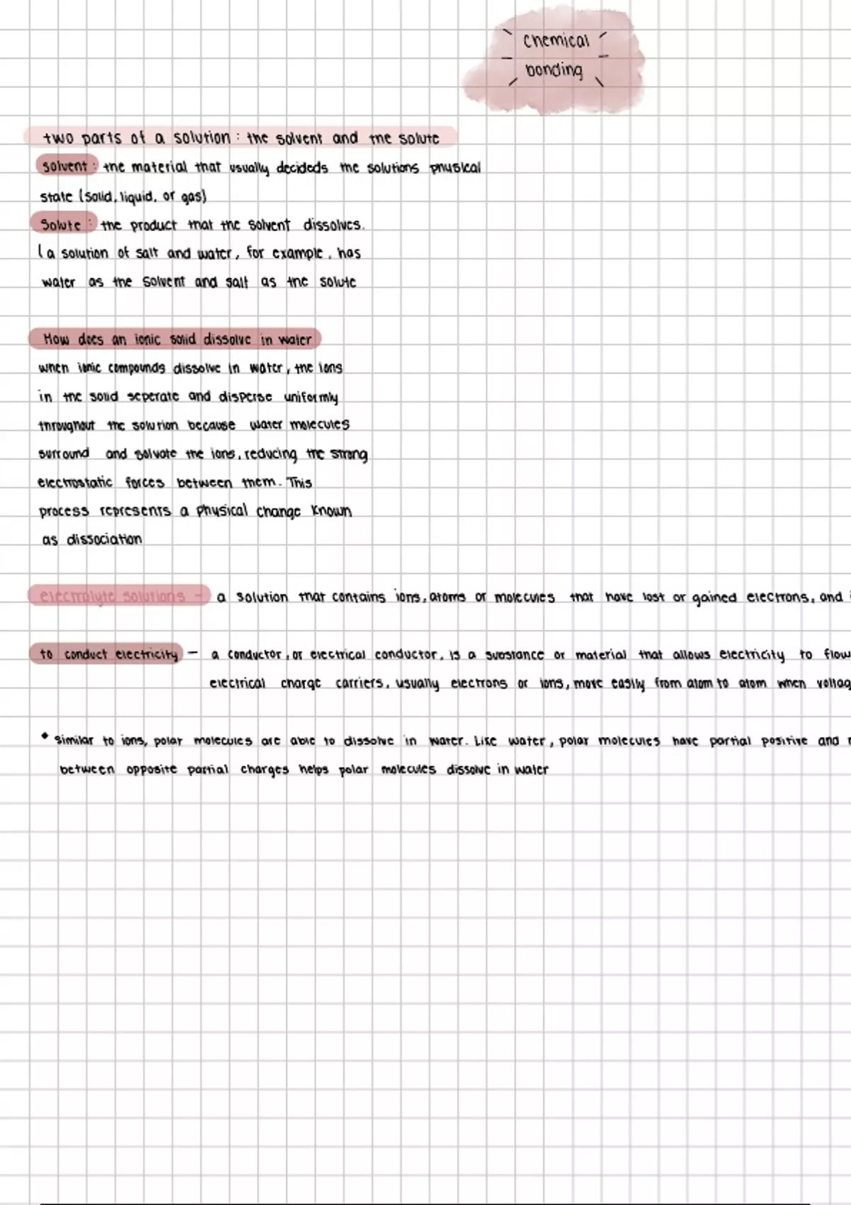 This document is focused on chemical bonding. There are notes on the solvent and solutes and how ionic solids dissolve in water.