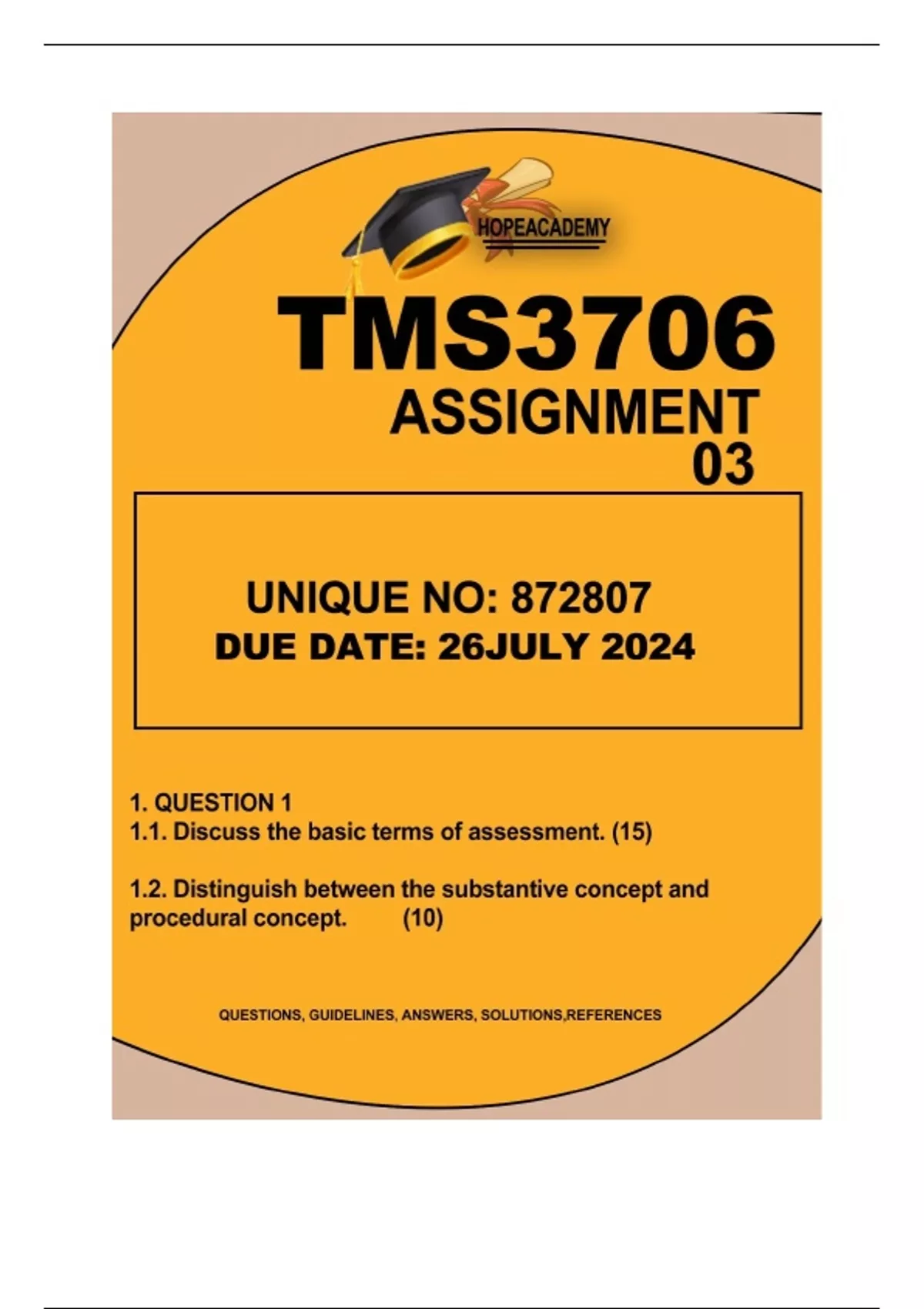 TMN3706 ASSIGNMENT 03...UNIQUE NUMBER: 872807....DUE DATE: 26-07-24 1. QUESTION 1 1.1. Discuss the basic terms of assessment. (15) 1.2. Distinguish between the substantive concept and procedural concept. (10) QUESTION 2 Discuss ideology as a philosophical aspect which can be utilised as a guide for consideration when planning a lesson. (25)