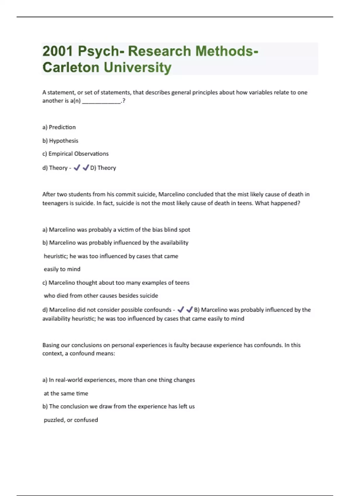 A statement, or set of statements, that describes general principles about how variables relate to one another is a(n) ____________.? a) Prediction b) Hypothesis c) Empirical Observations d) Theory - D) Theory After two students from his commit suicide, Marcelino concluded that the mist likely cause of death in teenagers is suicide. In fact, suicide is not the most likely cause of death in teens. What happened? a) Marcelino was probably a victim of the bias blind spot b) Marcelino was probably influenced by the availability heuristic; he was too influenced by cases that came easily to mind c) Marcelino thought about too many examples of teens who died from other causes besides suicide d) Marcelino did not consider possible confounds - B) Marcelino was probably influenced by the availability heuristic; he was too influenced by cases that came easily to mind Basing our conclusions on personal experiences is faulty because experience has confounds. In this context, a confound means: a) In real-world experiences, more than one thing changes at the same time b) The conclusion we draw from the experience has left us puzzled, or confusedc) There has been no comparison group d) We will have trouble thinking of counterexamples - A) In real-world experiences more than one thing changes at the same time In most experiments, trade-offs are made between validities because it is not possible to achieve all four at once. What is the most common trade-off? a) Internal and External Validity b) Construct and Statistical Validity c) Statistical and Internal Validity d) External and Statistical Validity - A) Internal and External Validity In reading an empirical journal article, what are the two questions you should be asking as you read? a) What is the argument? What is the evidence to support the argument? b) Why was this research done? Were there any significant findings? c) How reputable is (are) the authors(s)? Did the findings include support for the hypotheses? d) How does this research relate to other research? What are ways to extend this research further? - A) What is the argument? What is the evidence to support the argument? To be an empiricist, one should: a) Base one's conclusions on direct observations b) Strive for parsimony c) Be sure that one's research can be applied in a real-world settingd) Discuss one's ideas in a public setting, such as an online chat room - A) Base one's conclusions on direct observations What does it mean to say the research is probabilistic? a) Researcher refer to the probability that their theories are correct b) Research predicts all possible results c) Research conclusions are meant to explain a certain proportion of possible cases, but not all possible cases d) If there are exceptions to a research result, it means that the theory is probably incorrect - C) Research conclusions are meant to explain a certain proportion of possible cases, but not all possible cases When is it a good idea to base conclusions on the advice of authorities? a) When authorities have an advanced degree, such as a Ph.D. or a Master's degree b) When authorities have conducted the research on which their advice is based, by systematically and objectively comparing different conditions c) It is never a good idea to base conclusions on the advice of authorities d) When authorities have several years of experience in their specialty area - B) When authorities have conducted the research on which their advice is based, by systematically and objectively comparing different conditions Which of the following headlines is a casual claim?a) Holding a gun may make you think others are, too b) Younger people can't read emotions on wrinkled faces c) Strange but true: Babies born in the autumn are more likely to love to 100 d) Check the baby! Many new moms show signs of OCD - A) Holding a gun may make you think others are, too Which of the following headlines is a frequency claim? a) Obese kids less sensitive to tastes b) Exercise: 45% of you shake your booty in Zumba c) Feeling fat? Maybe Facebook is to blame d) Daycare and behavior problems are not linked - B) Exercise: 45% of you shake your booty in Zumba