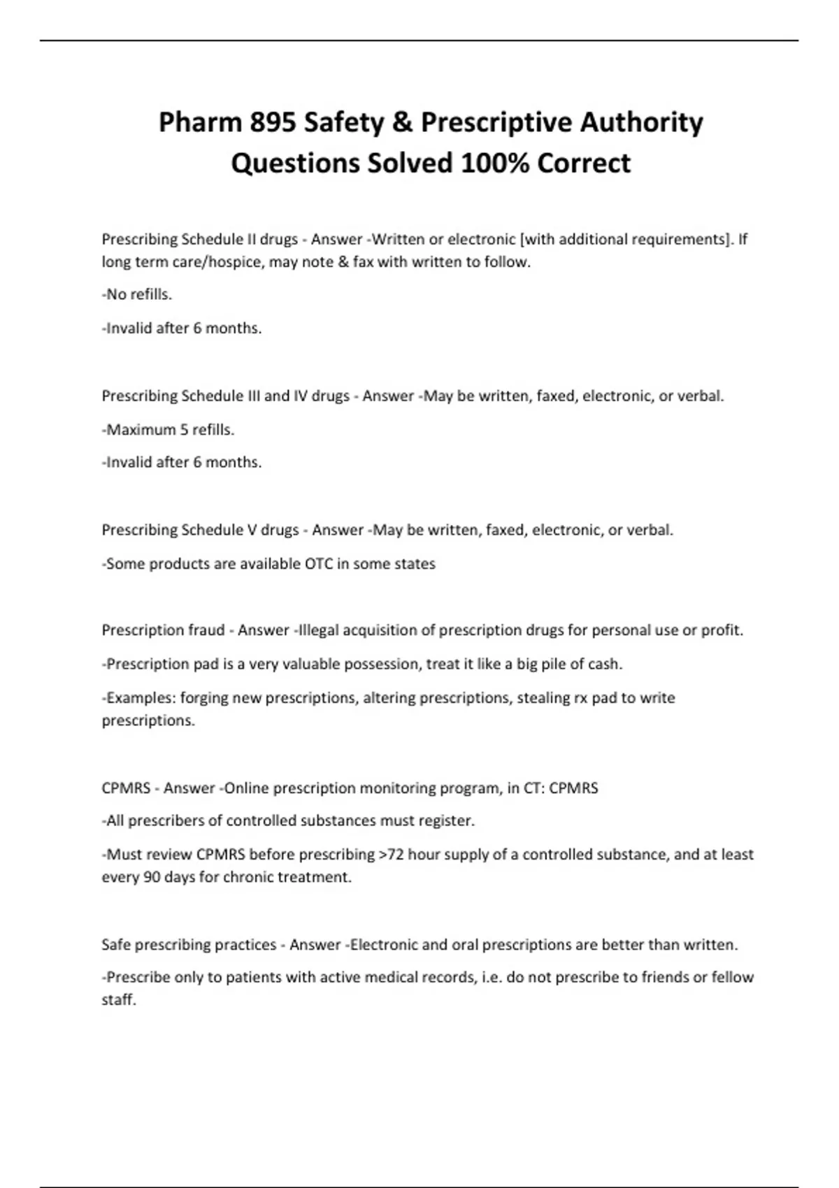 Pharm 895 Safety & Prescriptive Authority Questions Solved 100% Correct