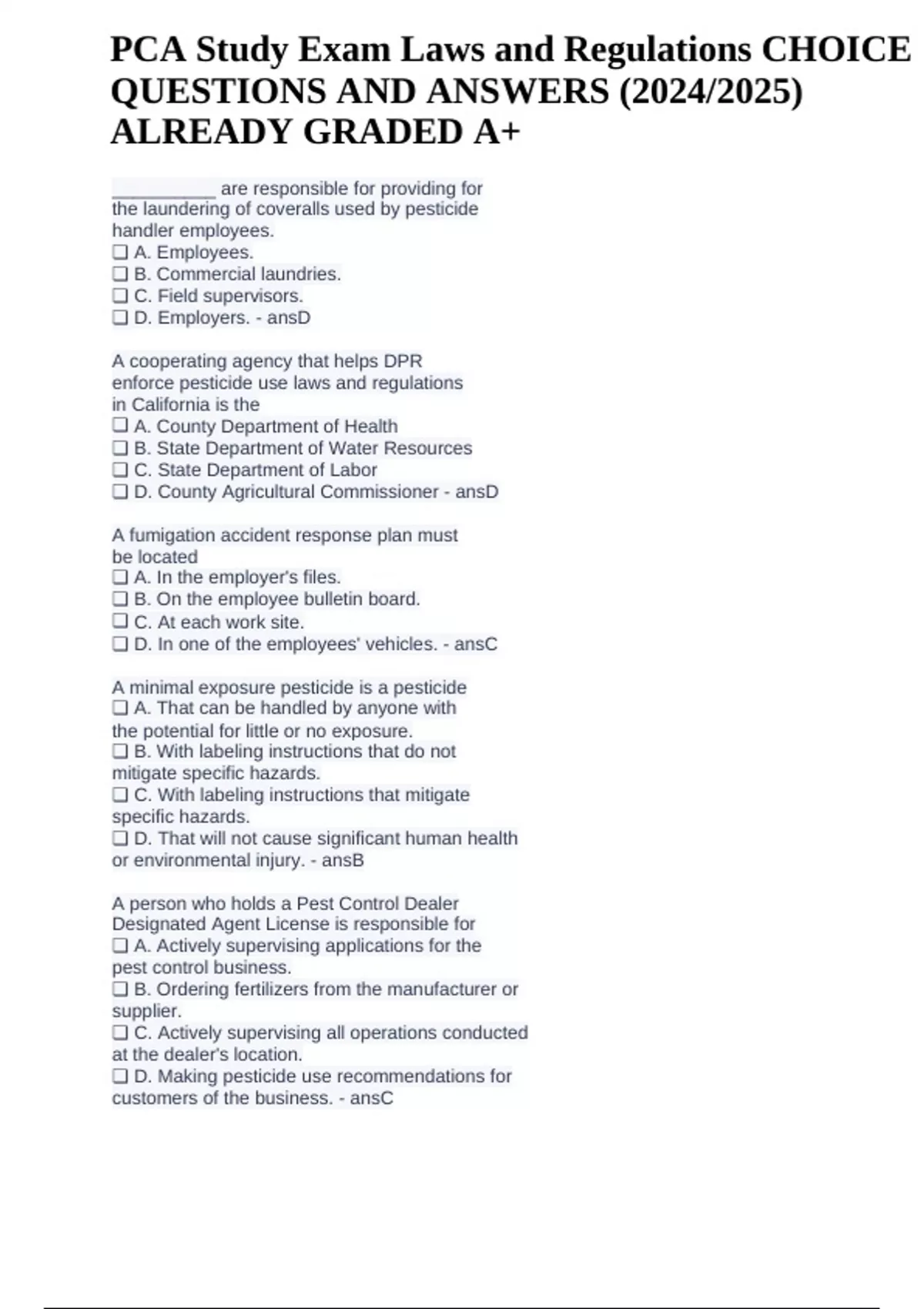 , PCA study exam Laws and Regulations CHOICE QUESTIONS AND ANSWERS |