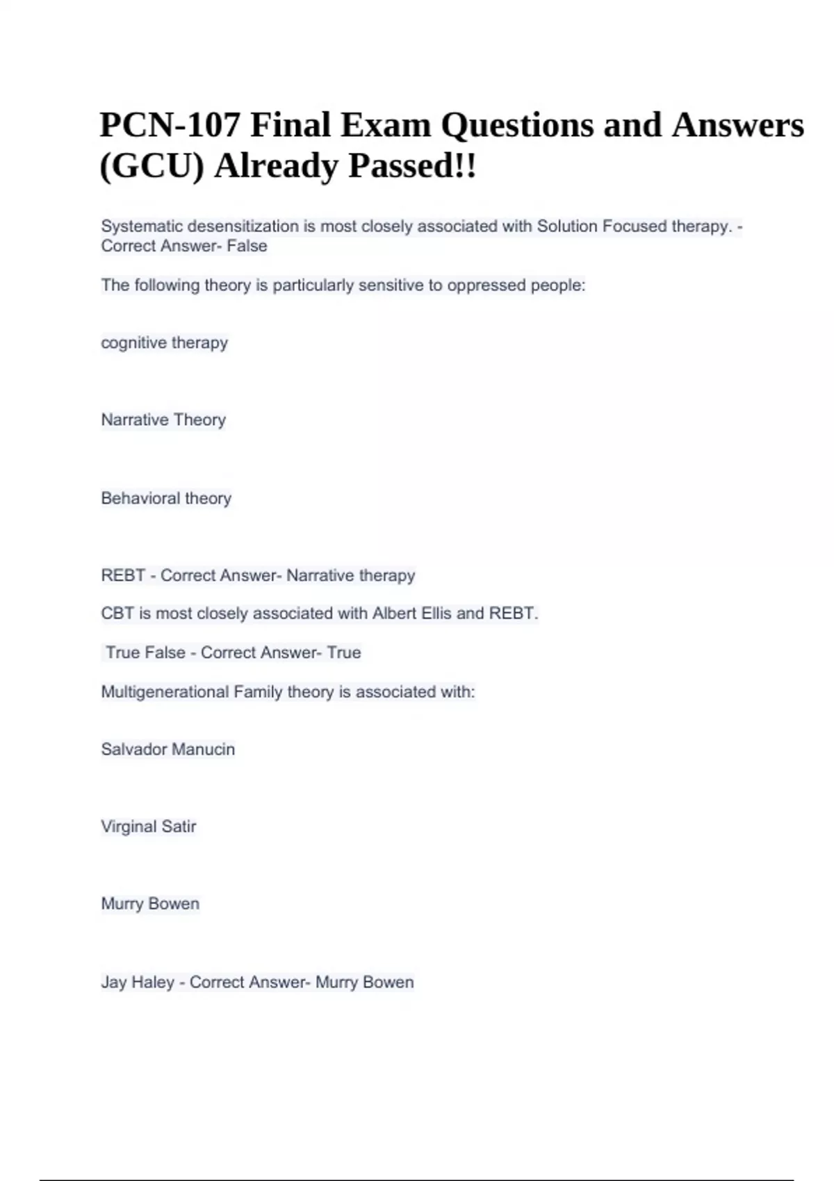 PCN-107 Final Exam Questions and Answers (GCU) Already Passed!! Systematic desensitization is most closely associated with Solution Focused therapy. - Correct Answer- False The following theory is particularly sensitive to oppressed people: cognitive therapy Narrative Theory Behavioral theory REBT - Correct Answer- Narrative therapy CBT is most closely associated with Albert Ellis and REBT. True False - Correct Answer- True Multigenerational Family theory is associated with: Salvador Manucin Virginal Satir Murry Bowen Jay Haley - Correct Answer- Murry Bowen PCN-107 Final Exam Questions and Answers (GCU) Already Passed!! Narrative therapy is a process that is concerned with the following: Oppression of groups of people Shorter term therapy Rewriting the client's story All of the above - Correct Answer- All of the above Albert Ellis believed that the meaning in life is always created, at least mostly, by the observer (client). True False - Correct Answer- True In Reality Theory the therapist role is as teacher and role model. True False - Correct Answer- True The ABC theory is most closely associated with: Aaron Beck Wubbolding Albert Ellis B. F. Skinner - Correct Answer- Albert Ellis Family therapies postulate that: Families have overt and covert rules. Boundaries are important. Each family strives to maintain homeostasis. All of the above - Correct Answer- All of the above The Beck Depression scale is used to measure the levels of depression in clients throughout their treatment. True False - Correct Answer- True Erik Erikson suggested that individuals: Pass through eight stages of development. Are affected by birth order Have psychosexual stages of development All of the above - Correct Answer- IDK the answer but it is NOT "all of the above" Family therapy: Views the individual within the context of the family system Can only be used with the family, but not the individual alone Is approved for work with Addiction clients Both a and c - Correct Answer- Both a and c