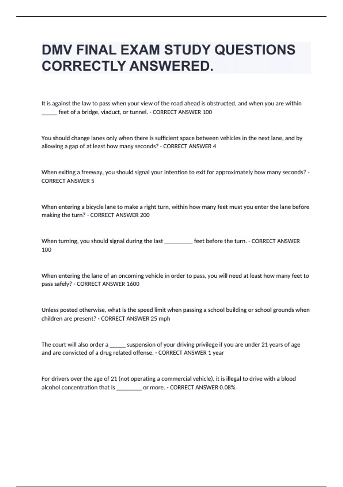 DMV FINAL EXAM STUDY QUESTIONS CORRECTLY ANSWERED. It is against the law to pass when your view of the road ahead is obstructed, and when you are within _____ feet of a bridge, viaduct, or tunnel. - CORRECT ANSWER 100 You should change lanes only when there is sufficient space between vehicles in the next lane, and by allowing a gap of at least how many seconds? - CORRECT ANSWER 4 When exiting a freeway, you should signal your intention to exit for approximately how many seconds? - CORRECT ANSWER 5 When entering a bicycle lane to make a right turn, within how many feet must you enter the lane before making the turn? - CORRECT ANSWER 200 When turning, you should signal during the last _________ feet before the turn. - CORRECT ANSWER 100 When entering the lane of an oncoming vehicle in order to pass, you will need at least how many feet to pass safely? - CORRECT ANSWER 1600 Unless posted otherwise, what is the speed limit when passing a school building or school grounds when children are present? - CORRECT ANSWER 25 mph The court will also order a _____ suspension of your driving privilege if you are under 21 years of age and are convicted of a drug related offense. - CORRECT ANSWER 1 year For drivers over the age of 21 (not operating a commercial vehicle), it is illegal to drive with a blood alcohol concentration that is ________ or more. - CORRECT ANSWER 0.08%