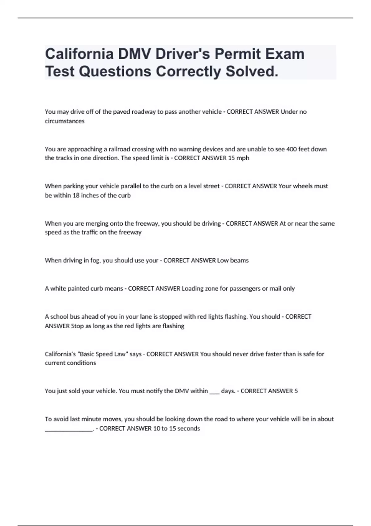 California DMV Driver's Permit Exam Test Questions Correctly Solved. You may drive off of the paved roadway to pass another vehicle - CORRECT ANSWER Under no circumstances You are approaching a railroad crossing with no warning devices and are unable to see 400 feet down the tracks in one direction. The speed limit is - CORRECT ANSWER 15 mph When parking your vehicle parallel to the curb on a level street - CORRECT ANSWER Your wheels must be within 18 inches of the curb When you are merging onto the freeway, you should be driving - CORRECT ANSWER At or near the same speed as the traffic on the freeway When driving in fog, you should use your - CORRECT ANSWER Low beams A white painted curb means - CORRECT ANSWER Loading zone for passengers or mail only A school bus ahead of you in your lane is stopped with red lights flashing. You should - CORRECT ANSWER Stop as long as the red lights are flashing California's "Basic Speed Law" says - CORRECT ANSWER You should never drive faster than is safe for current conditions You just sold your vehicle. You must notify the DMV within ___ days. - CORRECT ANSWER 5 To avoid last minute moves, you should be looking down the road to where your vehicle will be in about ______________. - CORRECT ANSWER 10 to 15 seconds