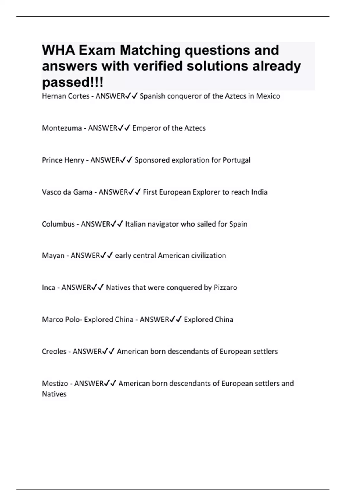 WHA Exam Matching questions and answers with verified solutions already passed!!!