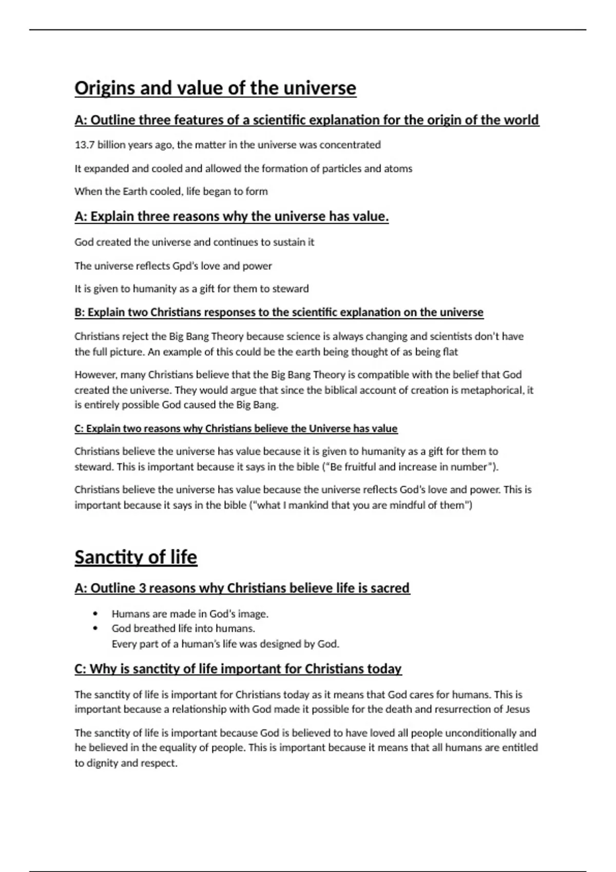 A: Outline 3 reasons why Christians believe life is sacred