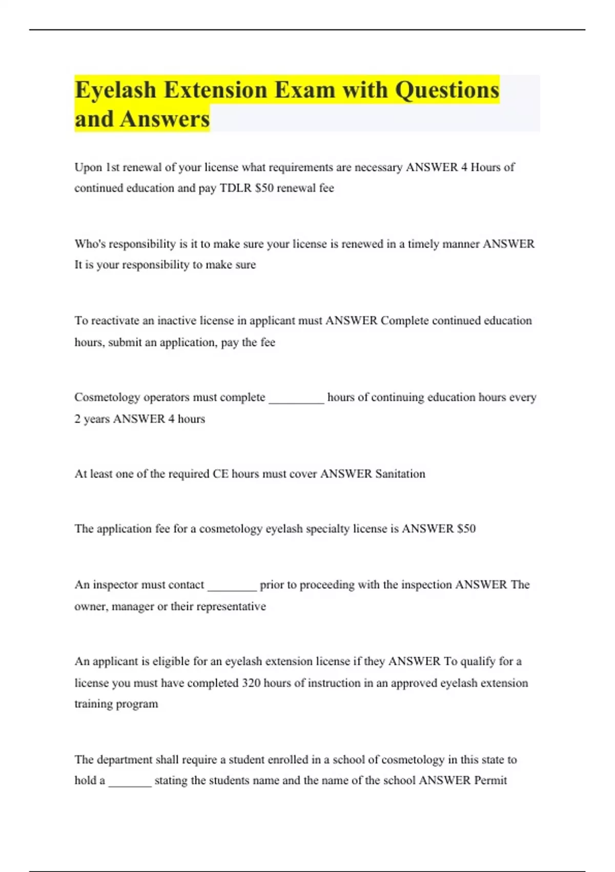 Eyelash Extension Exam with Questions and Answers Upon 1st renewal of your license what requirements are necessary ANSWER 4 Hours of continued education and pay TDLR $50 renewal fee Who's responsibility is it to make sure your license is renewed in a timely manner ANSWER It is your responsibility to make sure To reactivate an inactive license in applicant must ANSWER Complete continued education hours, submit an application, pay the fee Cosmetology operators must complete _________ hours of continuing education hours every 2 years ANSWER 4 hours At least one of the required CE hours must cover ANSWER Sanitation The application fee for a cosmetology eyelash specialty license is ANSWER $50 An inspector must contact ________ prior to proceeding with the inspection ANSWER The owner, manager or their representative An applicant is eligible for an eyelash extension license if they ANSWER To qualify for a license you must have completed 320 hours of instruction in an approved eyelash extension training program The department shall require a student enrolled in a school of cosmetology in this state to hold a _______ stating the students name and the name of the school ANSWER Permit