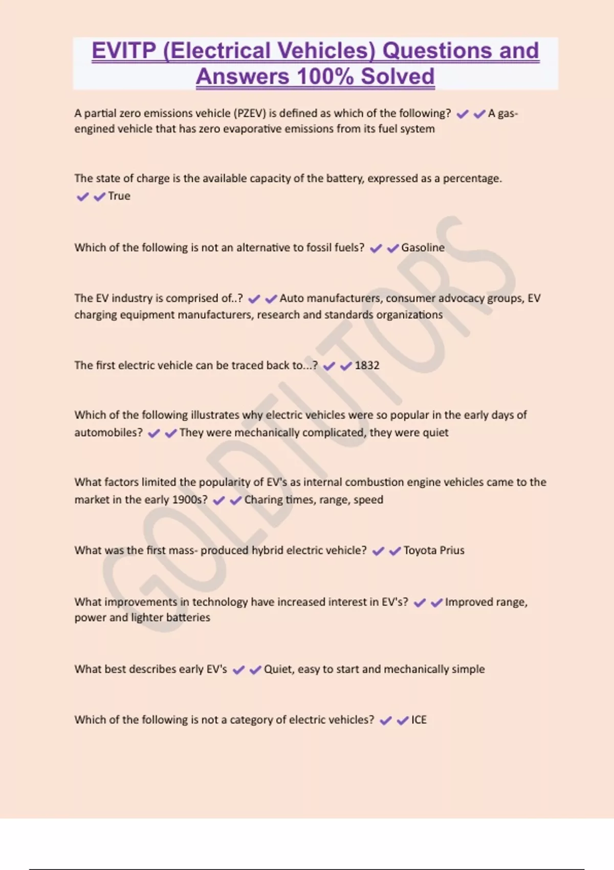 EVITP (Electrical Vehicles) Questions and Answers 100% Solved A partial zero emissions vehicle (PZEV) is defined as which of the following? A gasengined vehicle that has zero evaporative emissions from its fuel system The state of charge is the available capacity of the battery, expressed as a percentage. True Which of the following is not an alternative to fossil fuels? Gasoline The EV industry is comprised of..? Auto manufacturers, consumer advocacy groups, EV charging equipment manufacturers, research and standards organizations The first electric vehicle can be traced back to...? 1832 Which of the following illustrates why electric vehicles were so popular in the early days of automobiles? They were mechanically complicated, they were quiet