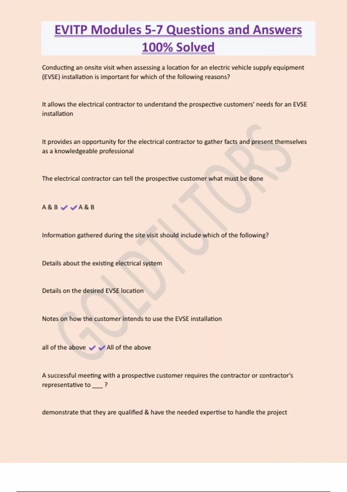 EVITP Modules 5-7 Questions and Answers 100% Solved Conducting an onsite visit when assessing a location for an electric vehicle supply equipment (EVSE) installation is important for which of the following reasons? It allows the electrical contractor to understand the prospective customers' needs for an EVSE installation It provides an opportunity for the electrical contractor to gather facts and present themselves as a knowledgeable professional The electrical contractor can tell the prospective customer what must be done A & B A & B Information gathered during the site visit should include which of the following?