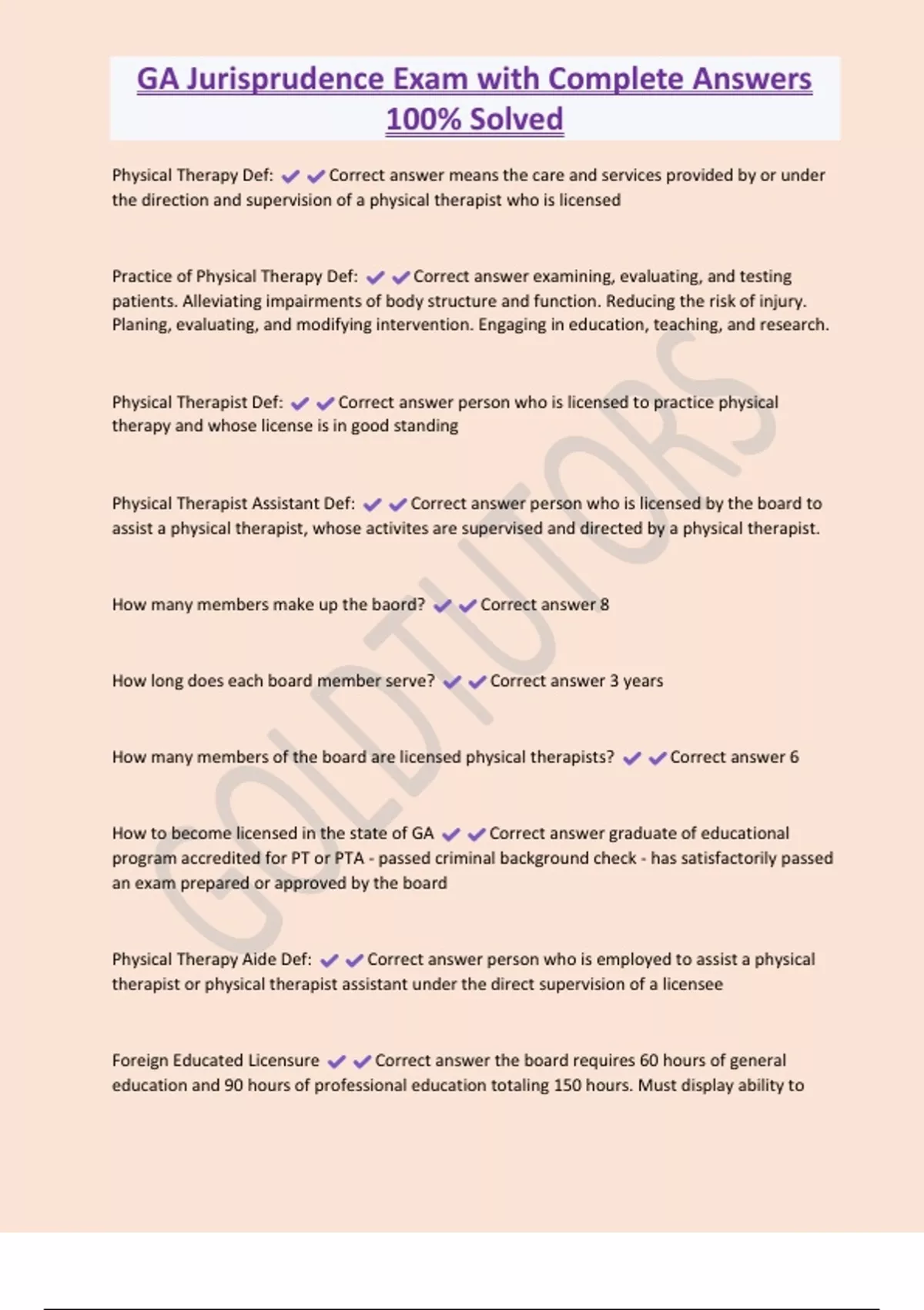 GA Jurisprudence Exam with Complete Answers 100% Solved Physical Therapy Def: Correct answer means the care and services provided by or under the direction and supervision of a physical therapist who is licensed Practice of Physical Therapy Def: Correct answer examining, evaluating, and testing patients. Alleviating impairments of body structure and function. Reducing the risk of injury. Planing, evaluating, and modifying intervention. Engaging in education, teaching, and research. Physical Therapist Def: Correct answer person who is licensed to practice physical therapy and whose license is in good standing