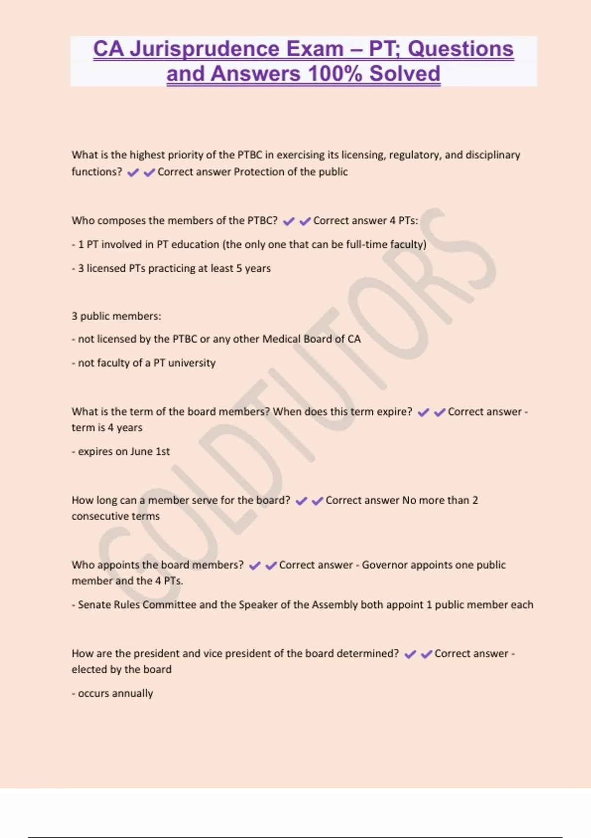 CA Jurisprudence Exam – PT; Questions and Answers 100% Solved What is the highest priority of the PTBC in exercising its licensing, regulatory, and disciplinary functions? Correct answer Protection of the public Who composes the members of the PTBC? Correct answer 4 PTs: - 1 PT involved in PT education (the only one that can be full-time faculty) - 3 licensed PTs practicing at least 5 years 3 public members: - not licensed by the PTBC or any other Medical Board of CA - not faculty of a PT university What is the term of the board members? When does this term expire? Correct answer - term is 4 years - expires on June 1st How long can a member serve for the board? Correct answer No more than 2