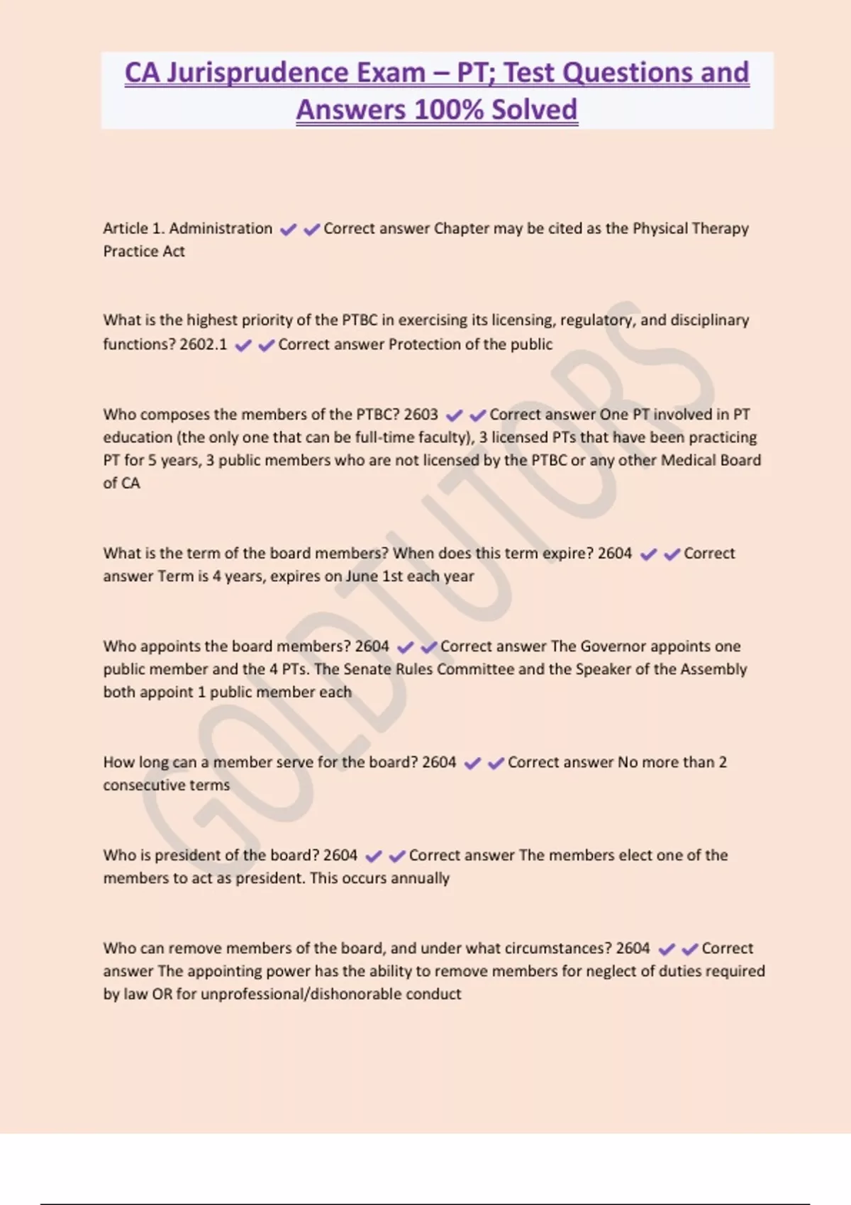 CA Jurisprudence Exam – PT; Test Questions and Answers 100% Solved Article 1. Administration Correct answer Chapter may be cited as the Physical Therapy Practice Act What is the highest priority of the PTBC in exercising its licensing, regulatory, and disciplinary functions? 2602.1 Correct answer Protection of the public Who composes the members of the PTBC? 2603 Correct answer One PT involved in PT education (the only one that can be full-time faculty), 3 licensed PTs that have been practicing PT for 5 years, 3 public members who are not licensed by the PTBC or any other Medical Board of CA What is the term of the board members? When does this term expire? 2604 Correct answer Term is 4 years, expires on June 1st each year Who appoints the board members? 2604 Correct answer The Governor appoints one public member and the 4 PTs. The Senate Rules Committee and the Speaker of the Assembly both appoint 1 public member each