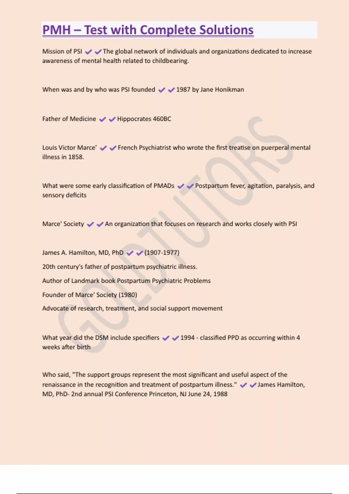 PMH – Test with Complete Solutions Mission of PSI The global network of individuals and organizations dedicated to increase awareness of mental health related to childbearing. When was and by who was PSI founded 1987 by Jane Honikman Father of Medicine Hippocrates 460BC Louis Victor Marce' French Psychiatrist who wrote the first treatise on puerperal mental illness in 1858. What were some early classification of PMADs Postpartum fever, agitation, paralysis, and sensory deficits Marce' Society An organization that focuses on research and works closely with PSI James A. Hamilton, MD, PhD () 20th century's father of postpartum psychiatric illness. Author of Landmark book Postpartum Psychiatric Probl