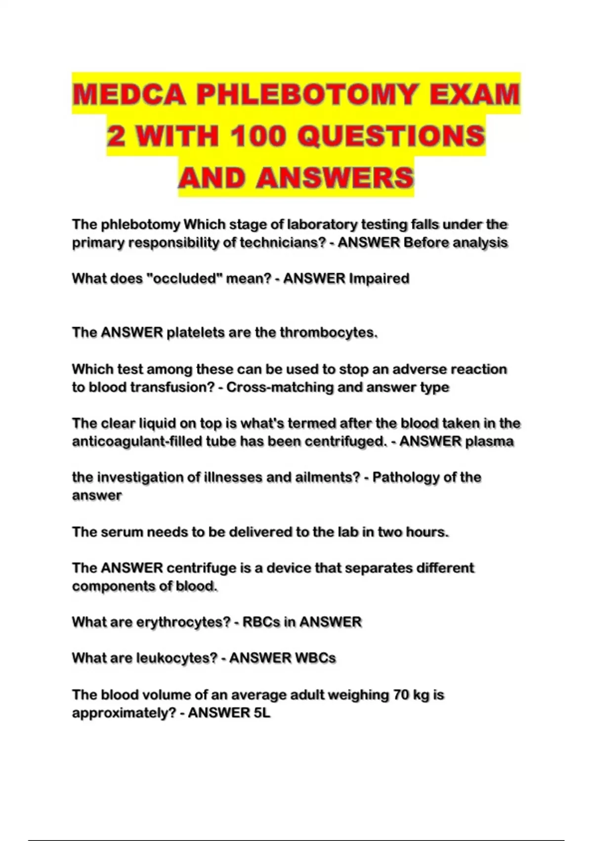 MEDCA PHLEBOTOMY EXAM 2 WITH 100 QUESTIONS AND ANSWERS...