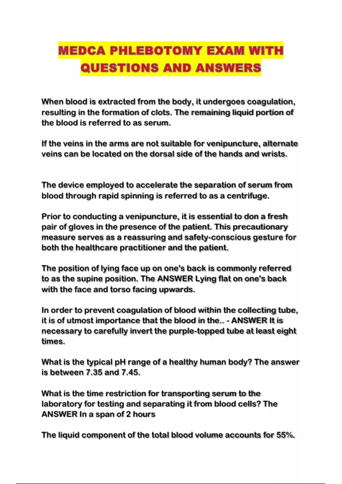 MEDCA PHLEBOTOMY EXAM WITH QUESTIONS AND ANSWERS...