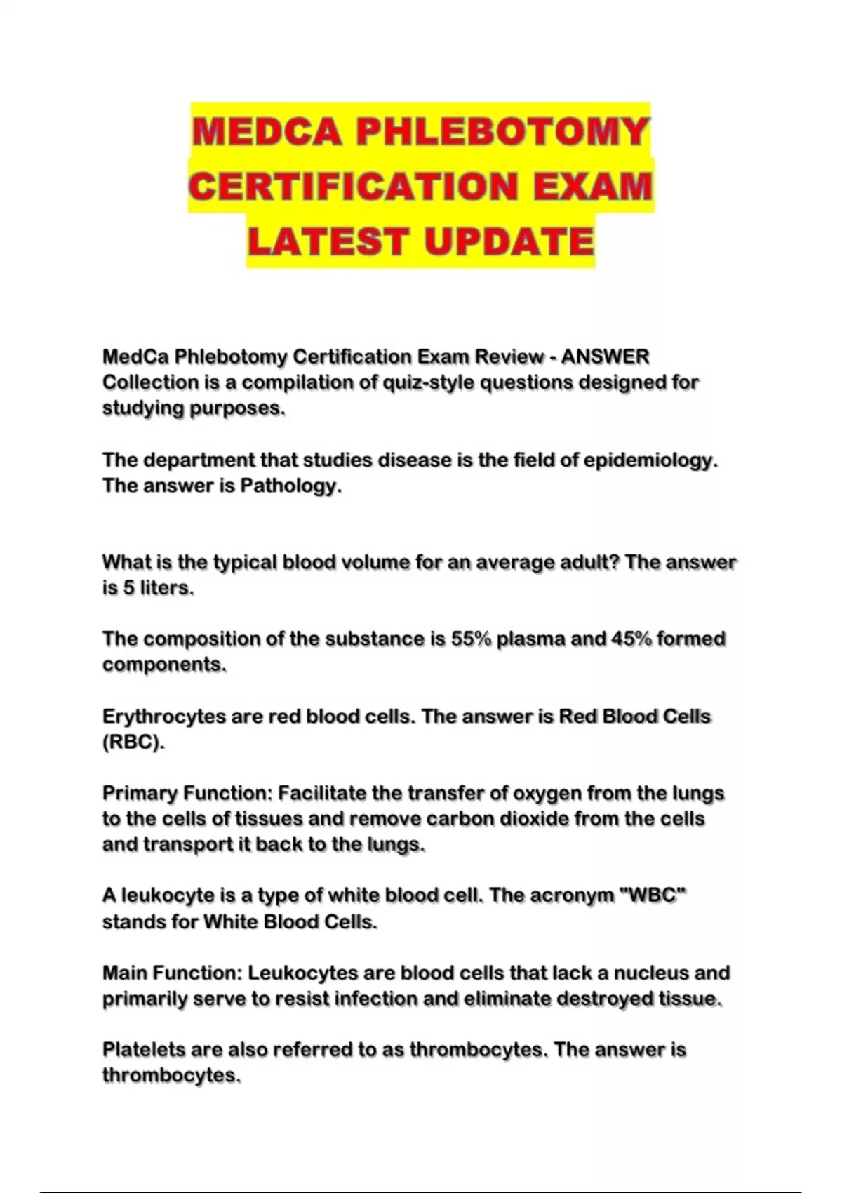 MEDCA PHLEBOTOMY CERTIFICATION EXAM LATEST UPDATE...