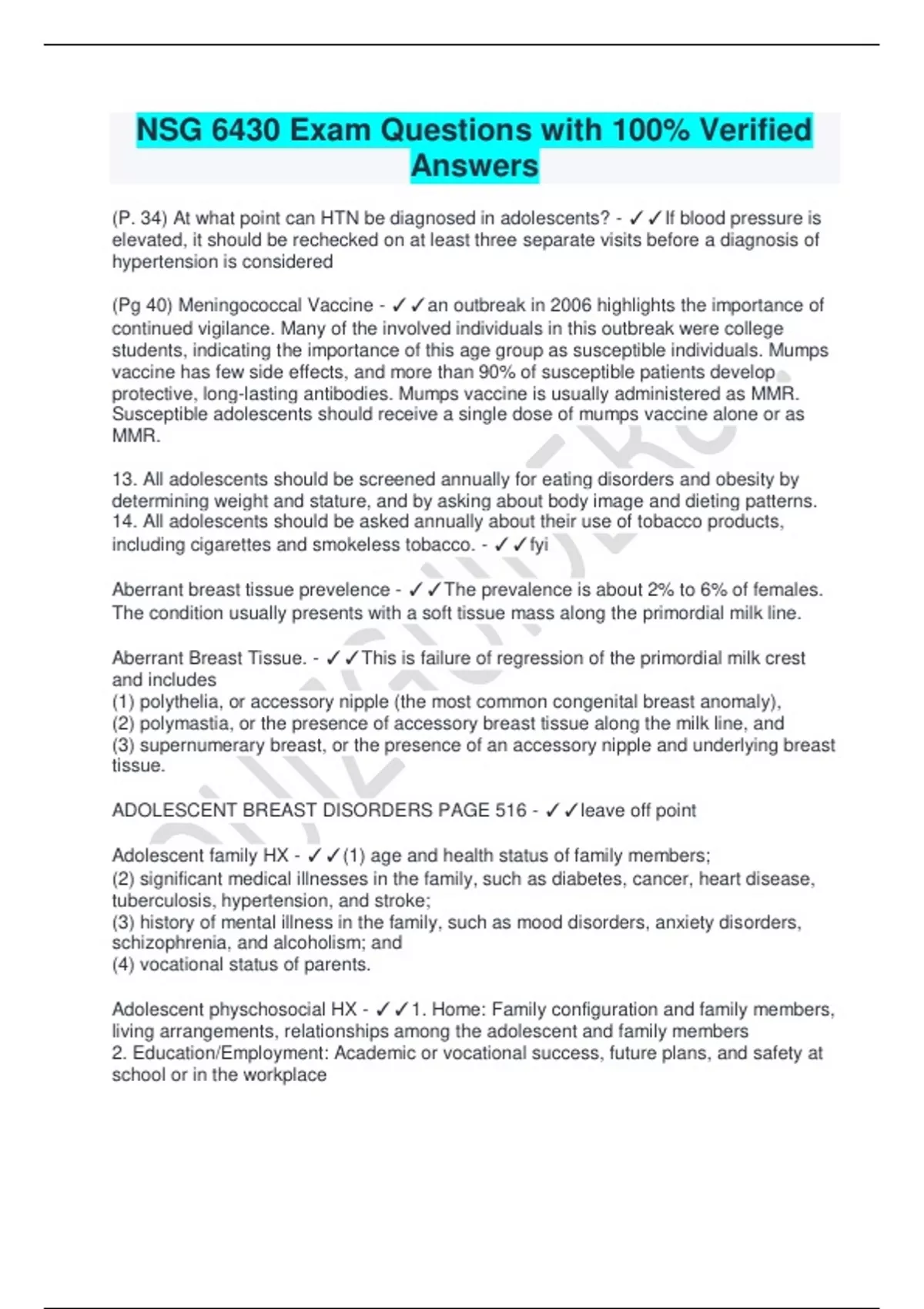 NSG 6430 Exam Questions with 100% Verified Answers (P. 34) At what point can HTN be diagnosed in adolescents? - If blood pressure is elevated, it should be rechecked on at least three separate visits before a diagnosis of hypertension is considered (Pg 40) Meningococcal Vaccine - an outbreak in 2006 highlights the importance of continued vigilance. Many of the involved individuals in this outbreak were college students, indicating the importance of this age group as susceptible individuals. Mumps vaccine has few side effects, and more than 90% of susceptible patients develop protective, long-lasting antibodies. Mumps vaccine is usually administered as MMR. Susceptible adolescents should receive a single dose of mumps vaccine alone or as MMR. 13. All adolescents should be screened annually for eating disorders and obesity by determining weight and stature, and by asking about body image and dieting patterns. 14. All adolescents should be asked annually about their use of tobacco products, including cigarettes and smokeless tobacco. - fyi Aberrant breast tissue prevelence - The prevalence is about 2% to 6% of females. The condition usually presents with a soft tissue mass along the primordial milk line. Aberrant Breast Tissue. - This is failure of regression of the primordial milk crest and includes (1) polythelia, or accessory nipple (the most common congenital breast anomaly), (2) polymastia, or the presence of accessory breast tissue along the milk line, and (3) supernumerary breast, or the presence of an accessory nipple and underlying breast tissue. ADOLESCENT BREAST DISORDERS PAGE 516 - leave off point Adolescent family HX - (1) age and health status of family members; (2) significant medical illnesses in the family, such as diabetes, cancer, heart disease, tuberculosis, hypertension, and stroke; (3) history of mental illness in the family, such as mood disorders, anxiety disorders, schizophrenia, and alcoholism; and (4) vocational status of parents. Adolescent physchosocial HX - 1. Home: Family configuration and family members, living arrangements, relationships among the adolescent and family members 2. Education/Employment: Academic or vocational success, future plans, and safety at school or in the workplace 3. Eating: Brief nutrition history, risk factor for obesity, concerns about weight or body image, disordered eating behaviors 4. Activities: Friendships with peers of the same and opposite sex, recreational activities, dating activity and relationships, sexual activity 5. Drugs: Personal use of tobacco, alcohol, illicit drugs, anabolic steroids; peer substance use; family substance use; driving while intoxicated 6. Sexuality: Sexual orientation, sexual activity, sexual abuse 7. Suicide (Mental Health): Feelings of sadness, loneliness, depression; pervasive boredom; inappropriately high levels of anxiety; suicidal thoughts 8. Safety: Risk of unintentional injury, risk from violence, fighting or weapon carrying, abuse Adolescent PMH - (1) childhood infections and illnesses; (2) prior hospitalizations and surgery; (3) significant injuries; (4) disabilities; (5) medications, including prescription medications, over-the-counter medications, complementary or alternative medications, vitamins, and nutritional supplements; (6) allergies; (7) immunization history; (8) developmental history, including prenatal, perinatal, and infancy history as well as history of problems with walking, talking, eating, learning, peer relations, and school functioning; and (9) mental health history, including a history of hospitalization, outpatient counseling, medications, school interventions, and other treatment. Adolescent ROS - 1. Vision: Trouble reading or watching television, vision correction 2. Hearing: Infections, trouble hearing, earaches 3. Dental: Prior care, pain, concerns (e.g., braces) 4. Head: Headaches, dizziness 5. Nose and throat: Frequent colds or sore throats, respiratory allergies 6. Skin: Acne, moles, rashes, warts 7. Cardiovascular: Exercise intolerance, shortness of breath, chest pain, palpitations, syncope, physical activity 8. Respiratory: Asthma, cough, smoking, exposure to tuberculosis 9. Gastrointestinal: Abdominal pain, reflux, diarrhea, vomiting, bleeding 10. Genitourinary: Dysuria, bed-wetting, frequency, bleeding 11. Musculoskeletal: Limb pain, joint pain, or swelling 12. Central nervous system (CNS): Seizures, syncope 13. Menstrual: Menarche, frequency of menses, duration, menorrhagia or metrorrhagia, pain 14. Sexual: Sexual activity, contraception, pregnancy, abortions, sexually transmitted diseases (STDs) or STD symptoms ADOLESCENT SEXUAL DEVELOPMENT in early adolescence - (1) initiation of puberty; (2) extreme body concern and curiosity;