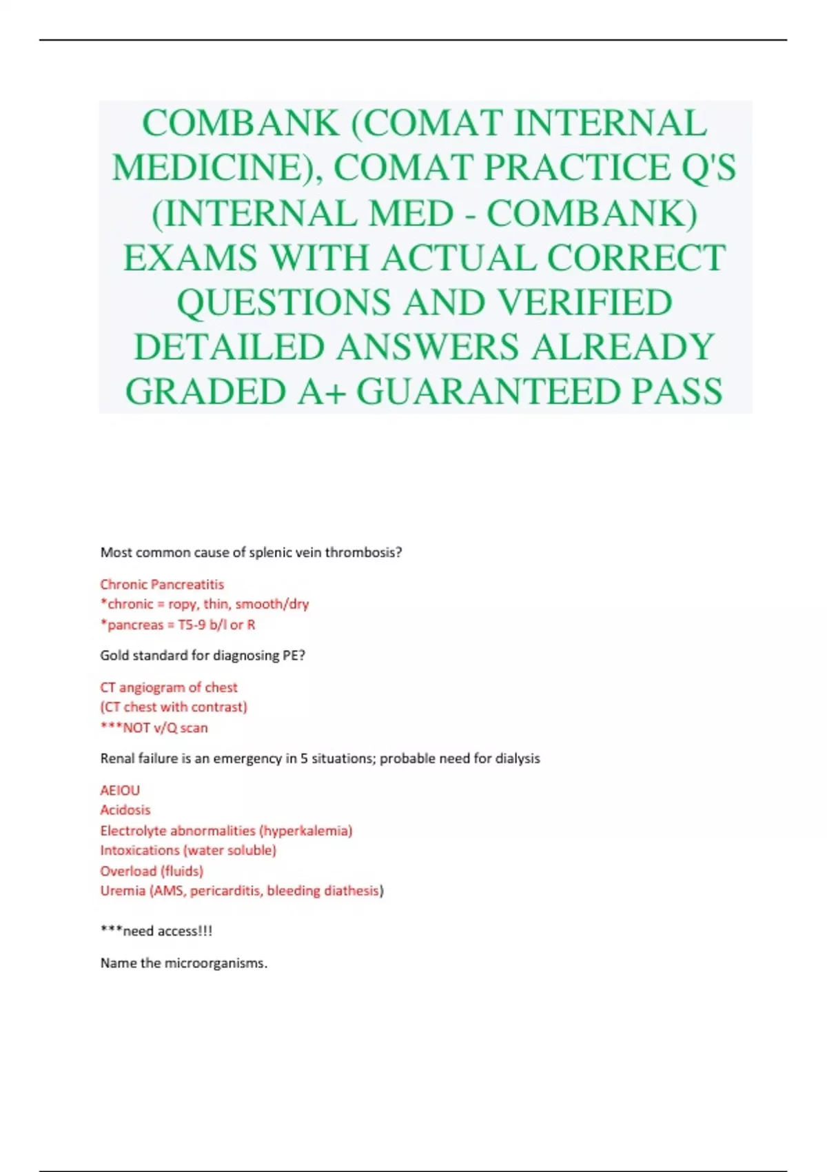 COMBANK (COMAT INTERNAL MEDICINE), COMAT PRACTICE Q'S (INTERNAL MED - COMBANK) EXAMS WITH ACTUAL CORRECT QUESTIONS AND VERIFIED DETAILED ANSWERS ALREADY GRADED A+ GUARANTEED PASS