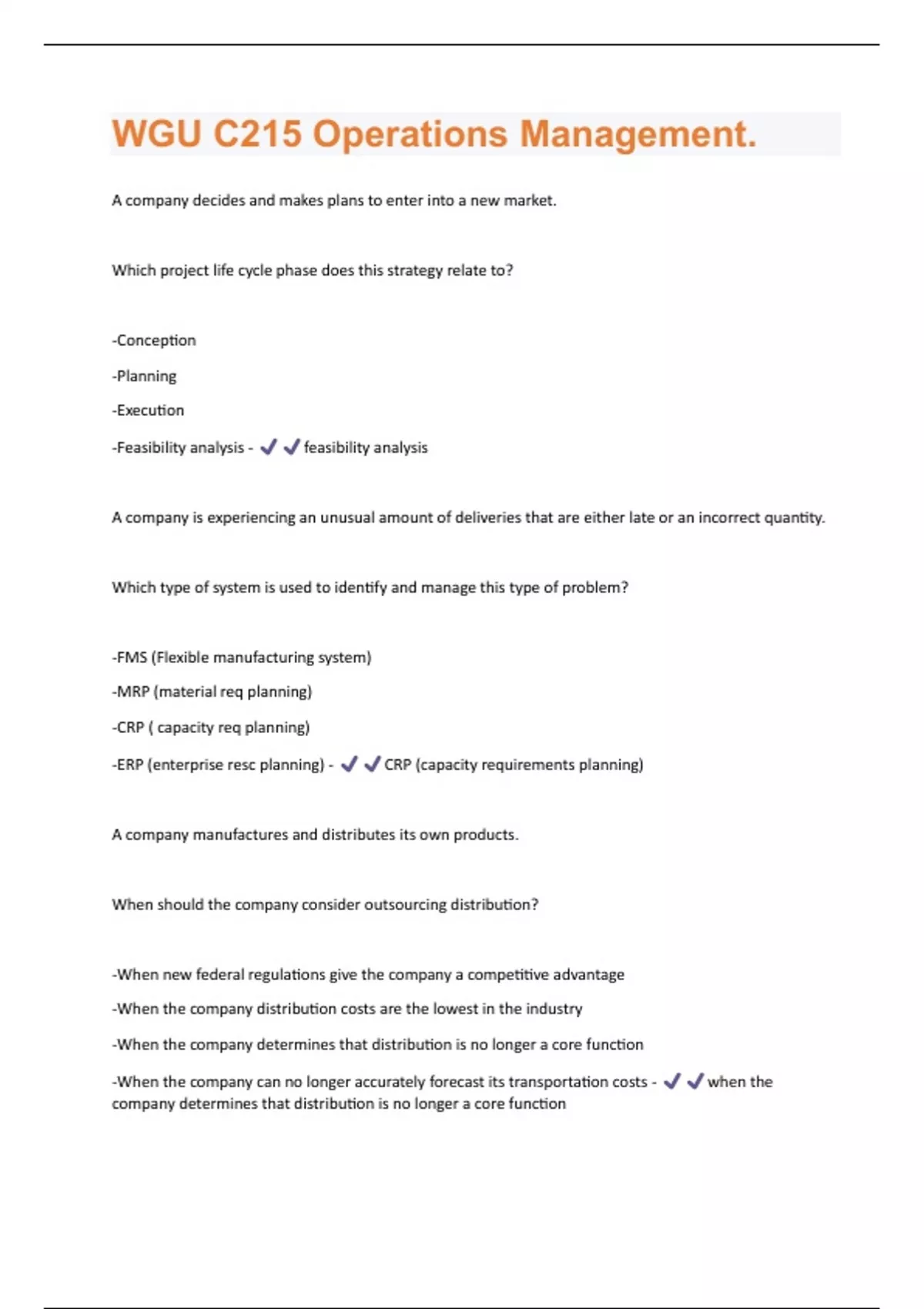 A company decides and makes plans to enter into a new market. Which project life cycle phase does this strategy relate to? -Conception -Planning -Execution -Feasibility analysis - feasibility analysis A company is experiencing an unusual amount of deliveries that are either late or an incorrect quantity. Which type of system is used to identify and manage this type of problem? -FMS (Flexible manufacturing system) -MRP (material req planning) -CRP ( capacity req planning) -ERP (enterprise resc planning) - CRP (capacity requirements planning) A company manufactures and distributes its own products. When should the company consider outsourcing distribution? -When new federal regulations give the company a competitive advantage -When the company distribution costs are the lowest in the industry -When the company determines that distribution is no longer a core function -When the company can no longer accurately forecast its transportation costs - when the company determines that distribution is no longer a core functionA company manufactures shoes using a quality management system. The company needs to put a process in place to measure any defects. The company would like to measure the number of defects and observe the number of occurrences to isolate the particular defect. Which quality tool should the company use to focus on correcting this particular issue? -Control Chart -Flowchart -Scatter Diagram -Checklist - checklist