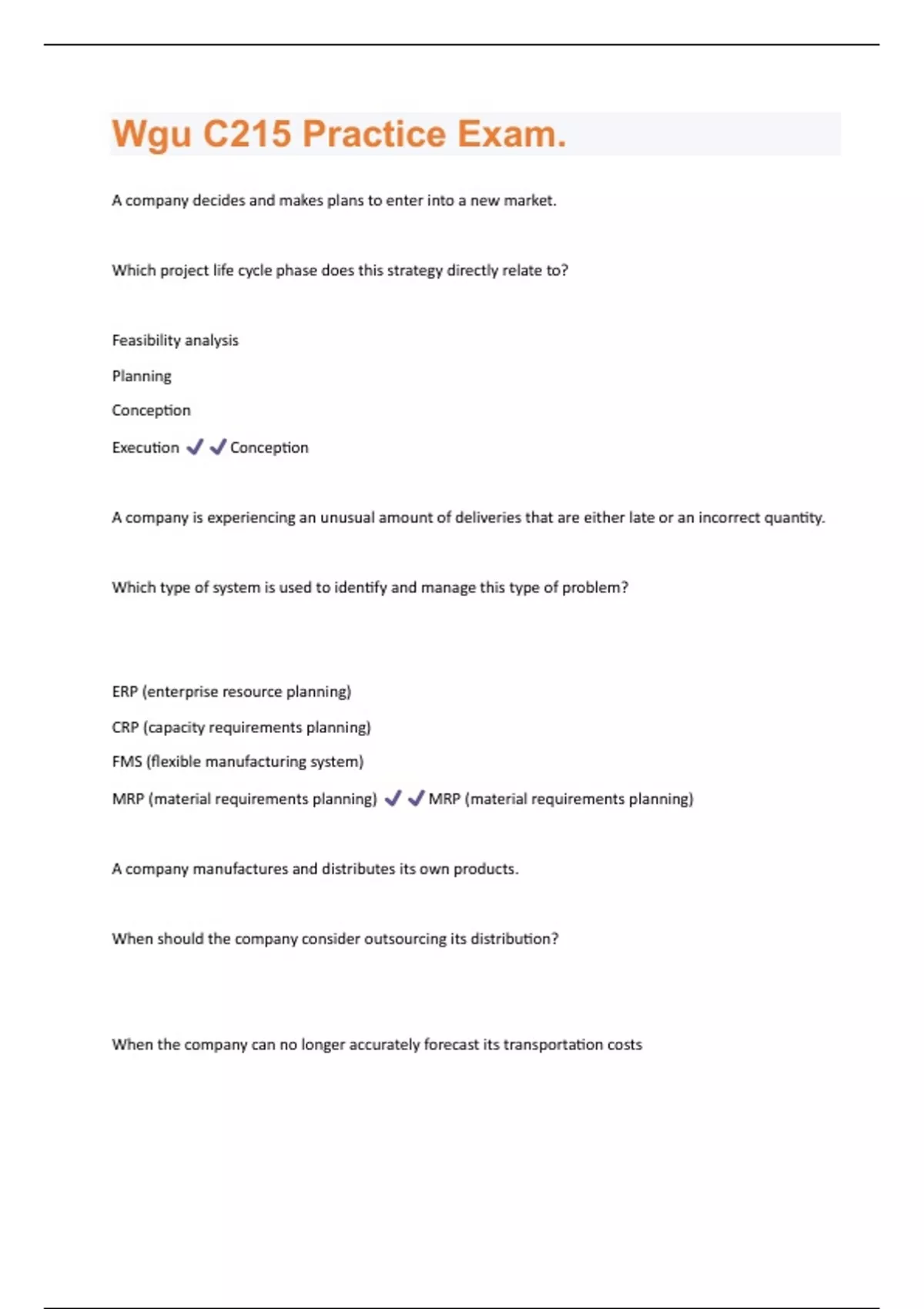 A company decides and makes plans to enter into a new market. Which project life cycle phase does this strategy directly relate to? Feasibility analysis Planning Conception Execution Conception A company is experiencing an unusual amount of deliveries that are either late or an incorrect quantity. Which type of system is used to identify and manage this type of problem? ERP (enterprise resource planning) CRP (capacity requirements planning) FMS (flexible manufacturing system) MRP (material requirements planning) MRP (material requirements planning) A company manufactures and distributes its own products. When should the company consider outsourcing its distribution? When the company can no longer accurately forecast its transportation costsWhen the company's distribution costs are the lowest in the industry When the company determines that distribution is no longer a core function When new federal regulations give the company a competitive advantage When the company determines that distribution is no longer a core function A company manufactures shoes using a quality management system. The company needs to put a process in place to measure any defects. The company would like to measure the number of defects and observe the number of occurrences to isolate the particular defect. Which quality tool should the company use to focus on correcting this particular issue? Scatter diagram Control chart Flowchart Checklist Checklist A company suddenly finds demand has increased to 140% of its previous capacity. It has been able to hire only a fraction of the employees previously laid off, and a warehouse fire destroyed 80% of its inventory. Which two options does the company have to rapidly meet the new demand? Choose 2 answers Hire temporary workers Build new production facilities Subcontract a portion of production capacity Hire and train new full-time employees Hire temporary workersSubcontract a portion of production capacity A company's monthly widgets demand has been consistent for the past few years but now a variable shift in demand is forecasted. The demands are predicted to be: • January 20,000 units • February 17,000 units • March 19,000 units • April 21,000 units • May 22,000 units • June 24,000 units Beginning inventory of 10,000 units should be maintained. What is the average monthly net widget production demand for the company? 20,000 20,500 21,667 22,167 20,500 A comprehensive automobile collision shop offers body and engine repair as well as custom vehicle paint options. Which two operational processes would suit this shop?Choose 2 answers Project process Line process Batch process Continuous process Batch process Project process