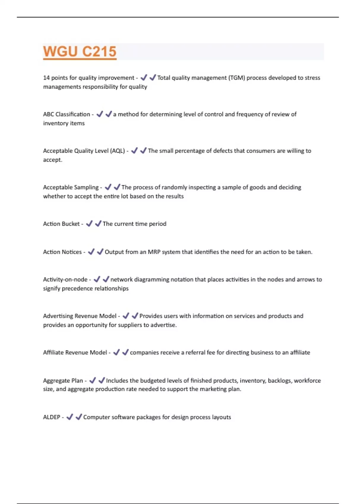 14 points for quality improvement - Total quality management (TGM) process developed to stress managements responsibility for quality ABC Classification - a method for determining level of control and frequency of review of inventory items Acceptable Quality Level (AQL) - The small percentage of defects that consumers are willing to accept. Acceptable Sampling - The process of randomly inspecting a sample of goods and deciding whether to accept the entire lot based on the results Action Bucket - The current time period Action Notices - Output from an MRP system that identifies the need for an action to be taken. Activity-on-node - network diagramming notation that places activities in the nodes and arrows to signify precedence relationships Advertising Revenue Model - Provides users with information on services and products and provides an opportunity for suppliers to advertise. Affiliate Revenue Model - companies receive a referral fee for directing business to an affiliate Aggregate Plan - Includes the budgeted levels of finished products, inventory, backlogs, workforce size, and aggregate production rate needed to support the marketing plan. ALDEP - Computer software packages for design process layoutsAllowance Factor - the amount of time the analyst allows for personal time, fatigue, and unavoidable delays Alternative Workplace - brings work to the worker rather than the worker to the workplace Anticipation Inventory - inventory built in anticipation of future demand Application Service Provider (ASP) - sets up and runs ERP systems Appraisal Costs - Costs incurred in the process of uncovering defects Assemble-to-order Strategy - produces standard components that can be combined to customer specifications Assignable causes of variation - Causes that can be identified and eliminated. Attributes - A product characteristic that has discrete value and can be counted Automated order entry system - A method using telephone models to send digital orders to suppliers Automation - Using machinery to perform work without human operators Average number of jobs in the system - measures work-in-process inventory Average outgoing quality (AOQ) - The expected proportion of defective items that will be passed to the customer under the sampling plan.Back orders - unfilled customer orders Back-order - Delaying delivery to the customer until the item becomes available. Backward integration - Owning or controlling sources of raw materials and components.