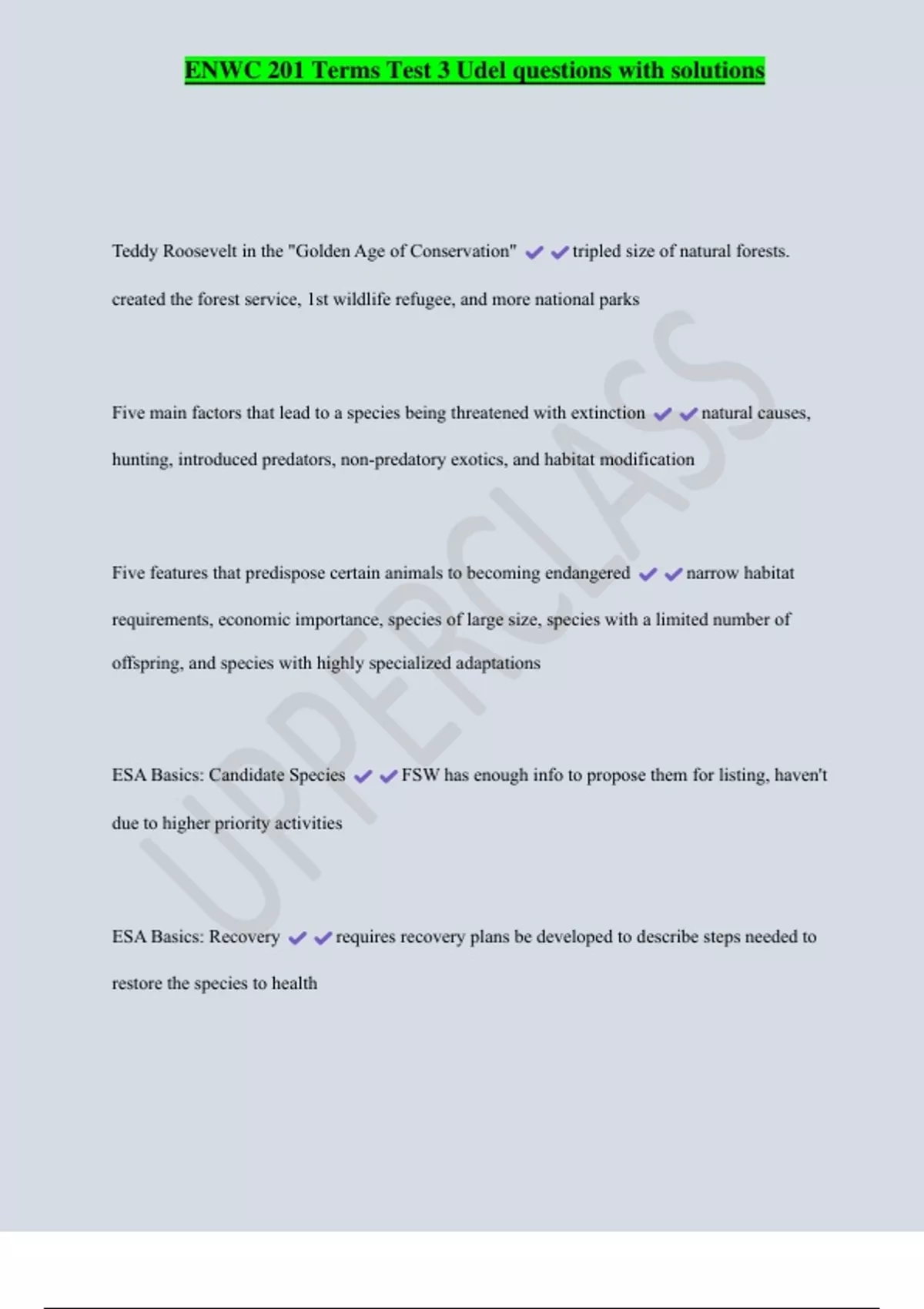ENWC 201 Terms Test 3 Udel questions with solutions Teddy Roosevelt in the "Golden Age of Conservation" tripled size of natural forests. created the forest service, 1st wildlife refugee, and more national parks Five main factors that lead to a species being threatened with extinction natural causes, hunting, introduced predators, non-predatory exotics, and habitat modification Five features that predispose certain animals to becoming endangered narrow habitat requirements, economic importance, species of large size, species with a limited number of offspring, and species with highly specialized adaptations ESA Basics: Candidate Species FSW has enough info to propose them for listing, haven't due to higher priority activities