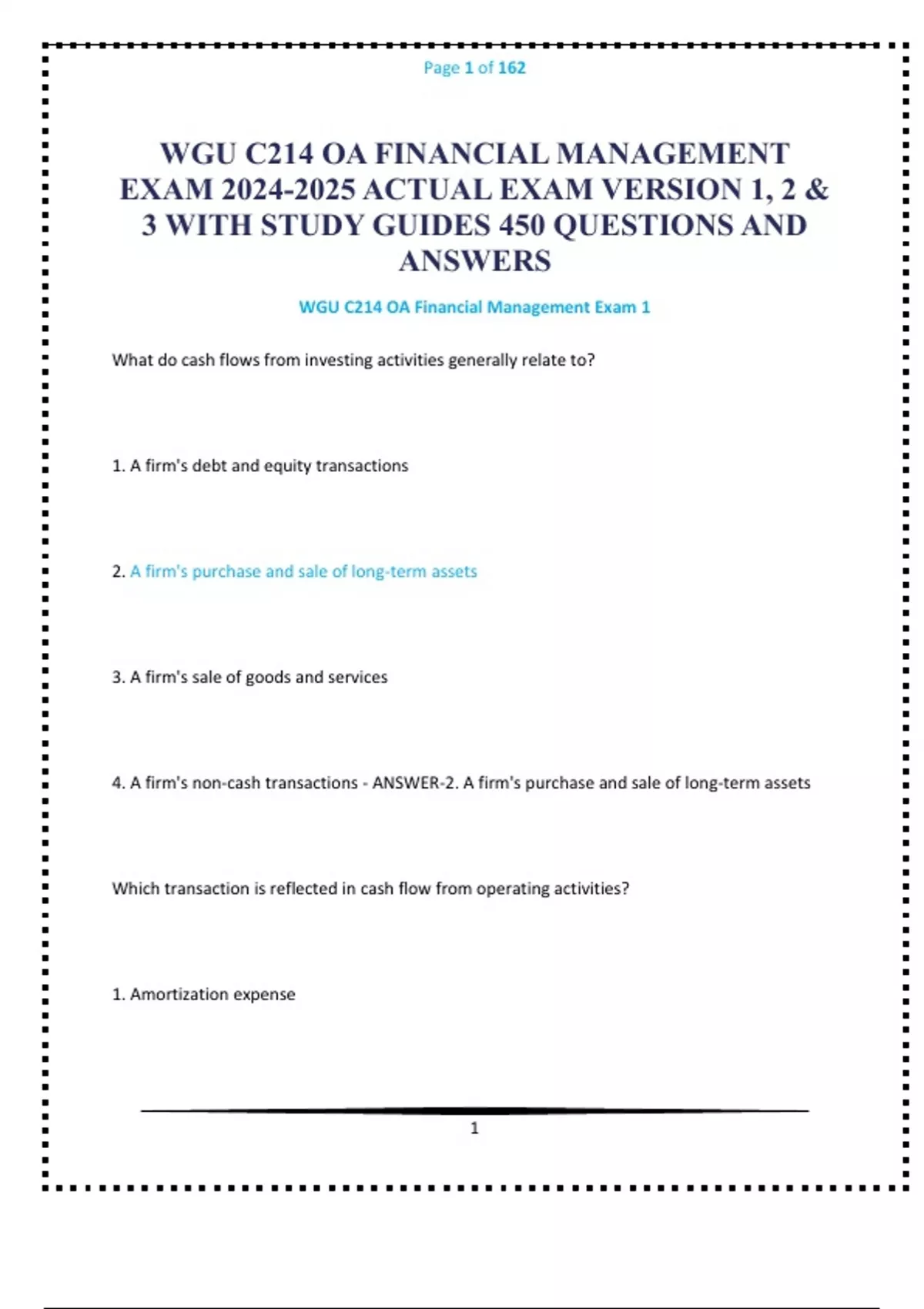 WGU C214 OA FINANCIAL MANAGEMENT EXAM ACTUAL EXAM VERSION 1, 2 & 3 WITH STUDY GUIDES 450 QUESTIONS AND ANSWERS